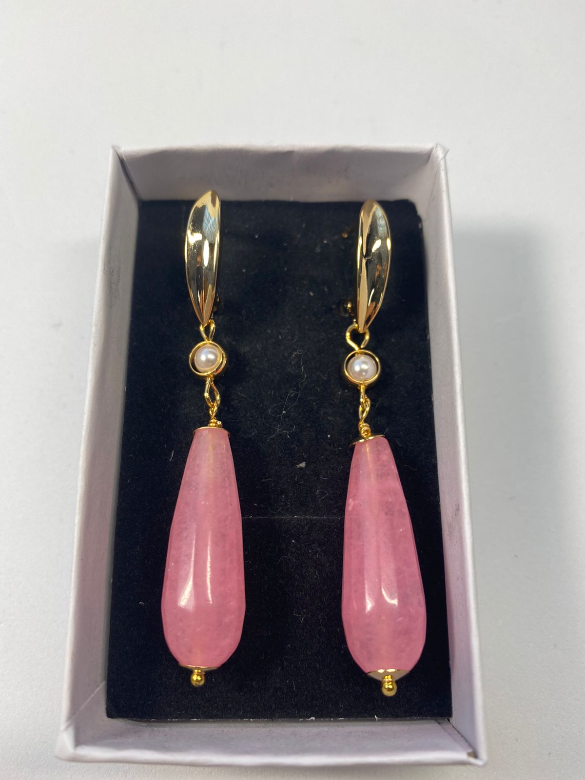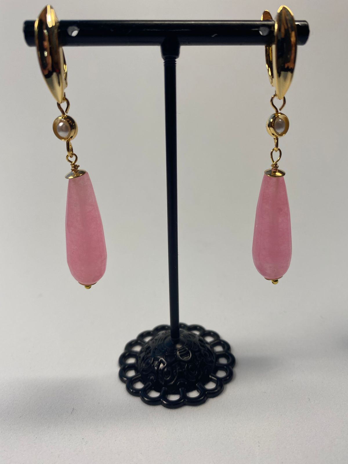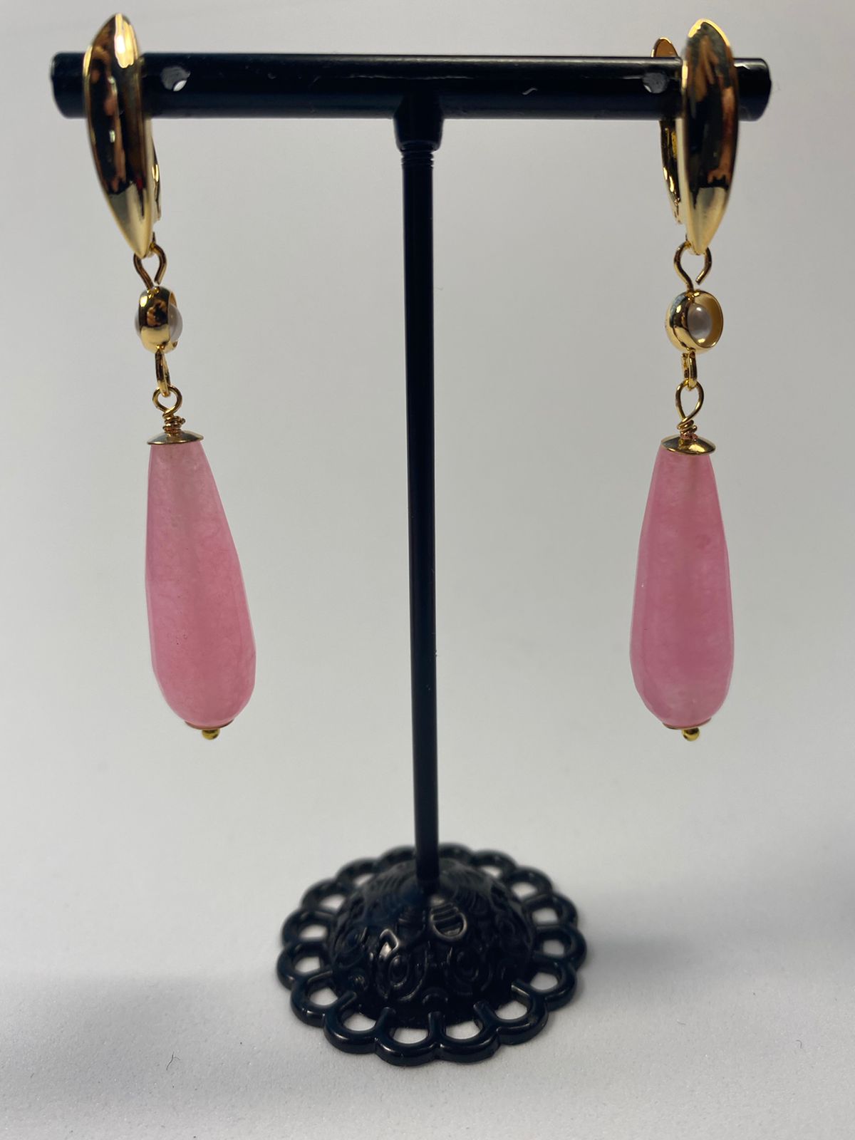 ვარდისფერი, ცრემლისებური ფორმის ხალცედონი ფურნიტურა და ინგლისური სტილის საყურის შესაკრავი ანტიალერგიული ოქროსფერი მეტალი.