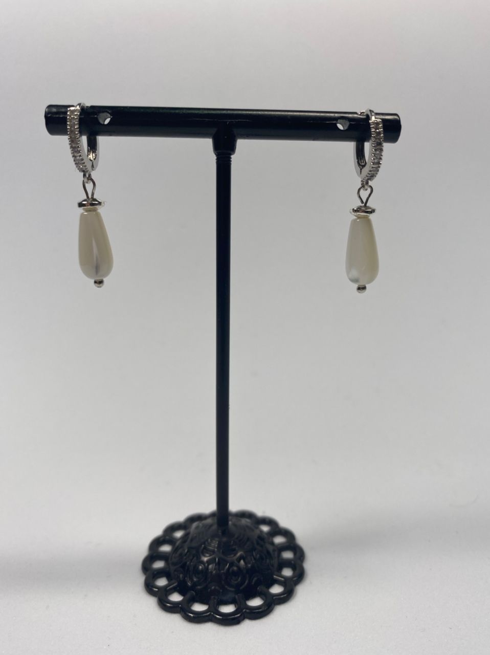მასალა:თეთრი ცრემლის ფორმის სადაფი, საყურის შესაკრავი ანტიალერგიული მოვერცხლილი მეტალი, ცირკონებით და დიამერტით 10მმ.