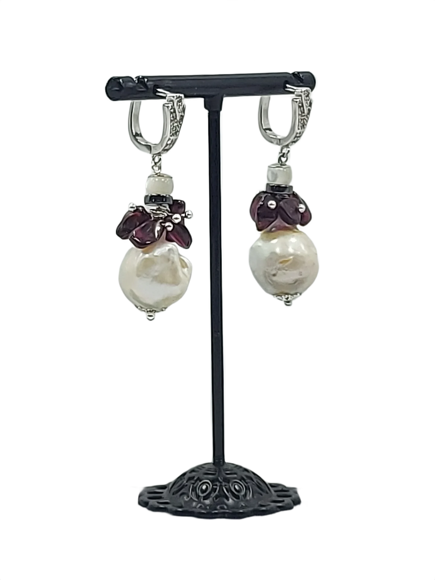 მასალა: თეთრი ბაროკოს მარგალიტი, ძოწი, სადაფის და ჰემატიტის დისკები, ვერცხლისფერი უჟანგავი ფურნიტურა და ანტიალერგიული, ცირკონებით გაწყობილი, ინგლისური სტილის საყურის შესაკრავი.