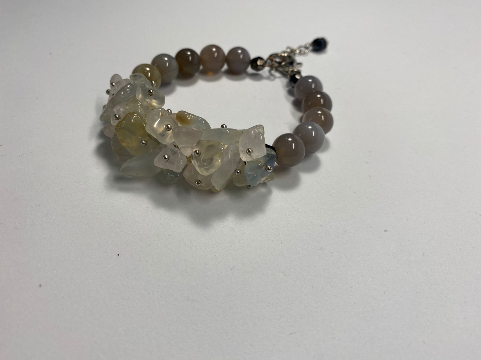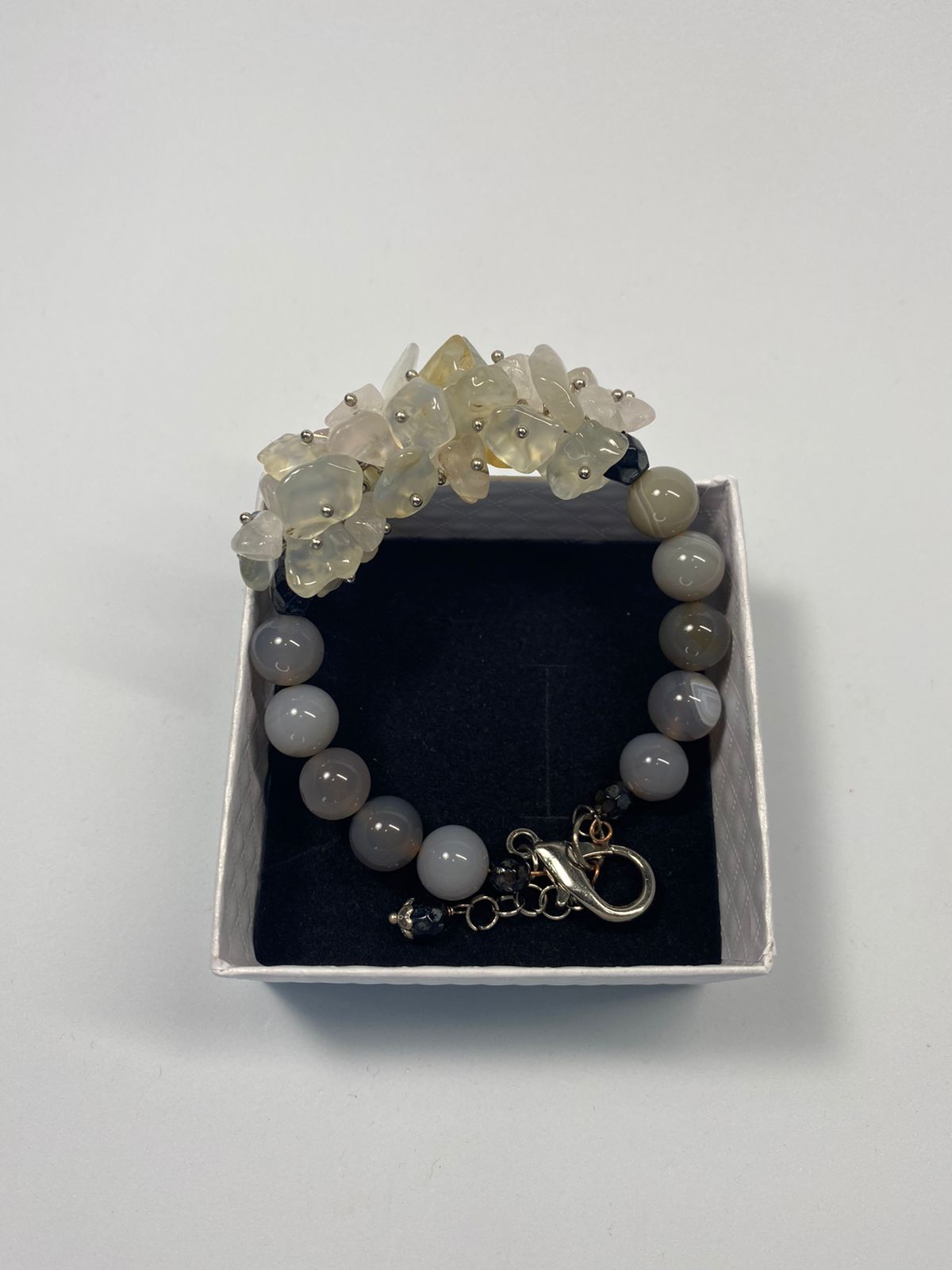 სამაჯურის მასალა: აკვამარინის ნამსხვრევები ვერცხლისფერ პინებზე (დიამეტრი 17მმ), სერი აგატის მძივები (დიამერტი 8მმ), შავი ჩეხური მძივები.