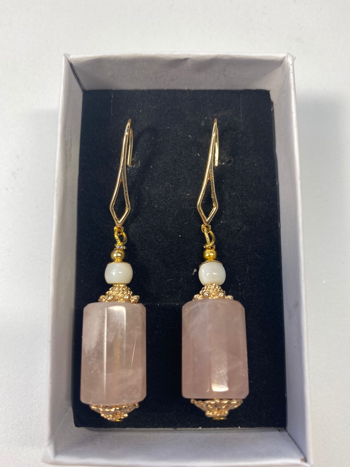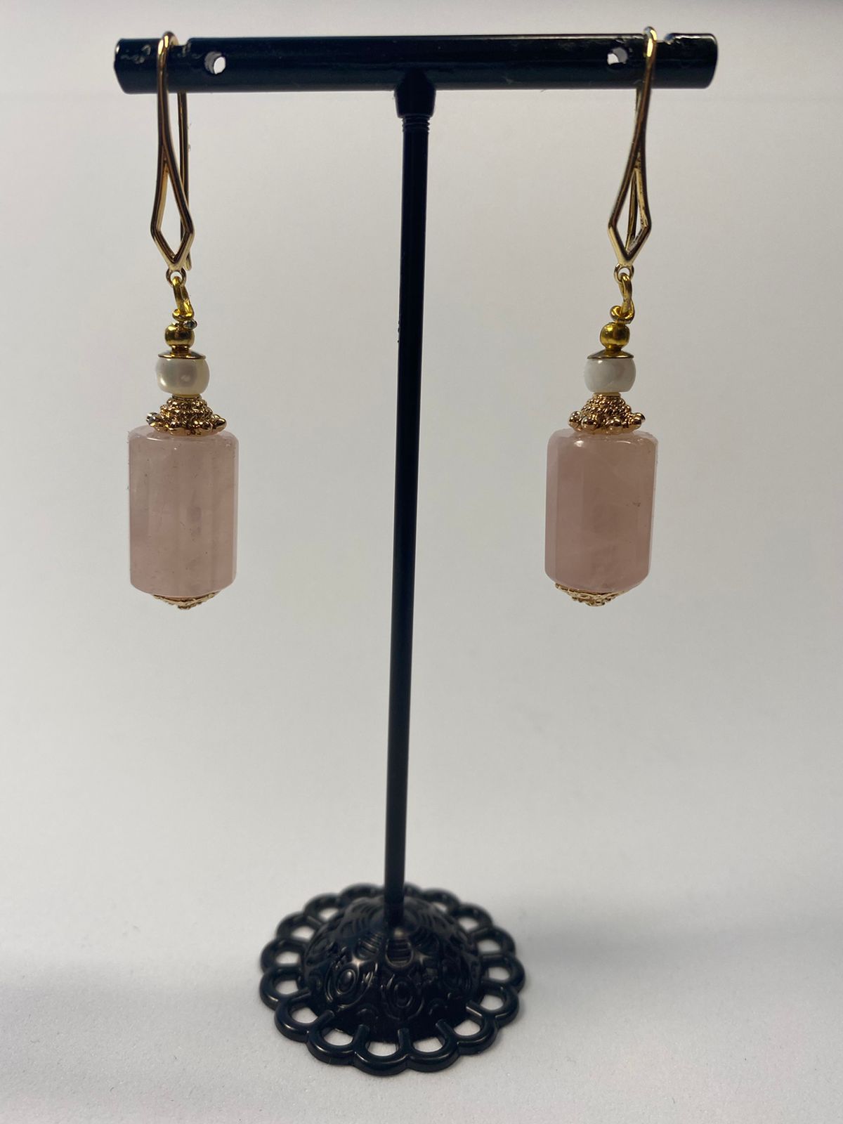 ვარდისფერი მოგრძო ფორმის კვარცი თეთრი სადაფი ფურნიტურა და საყურის შესაკრავი ანტიალერგიული ოქროსფერი მეტალი