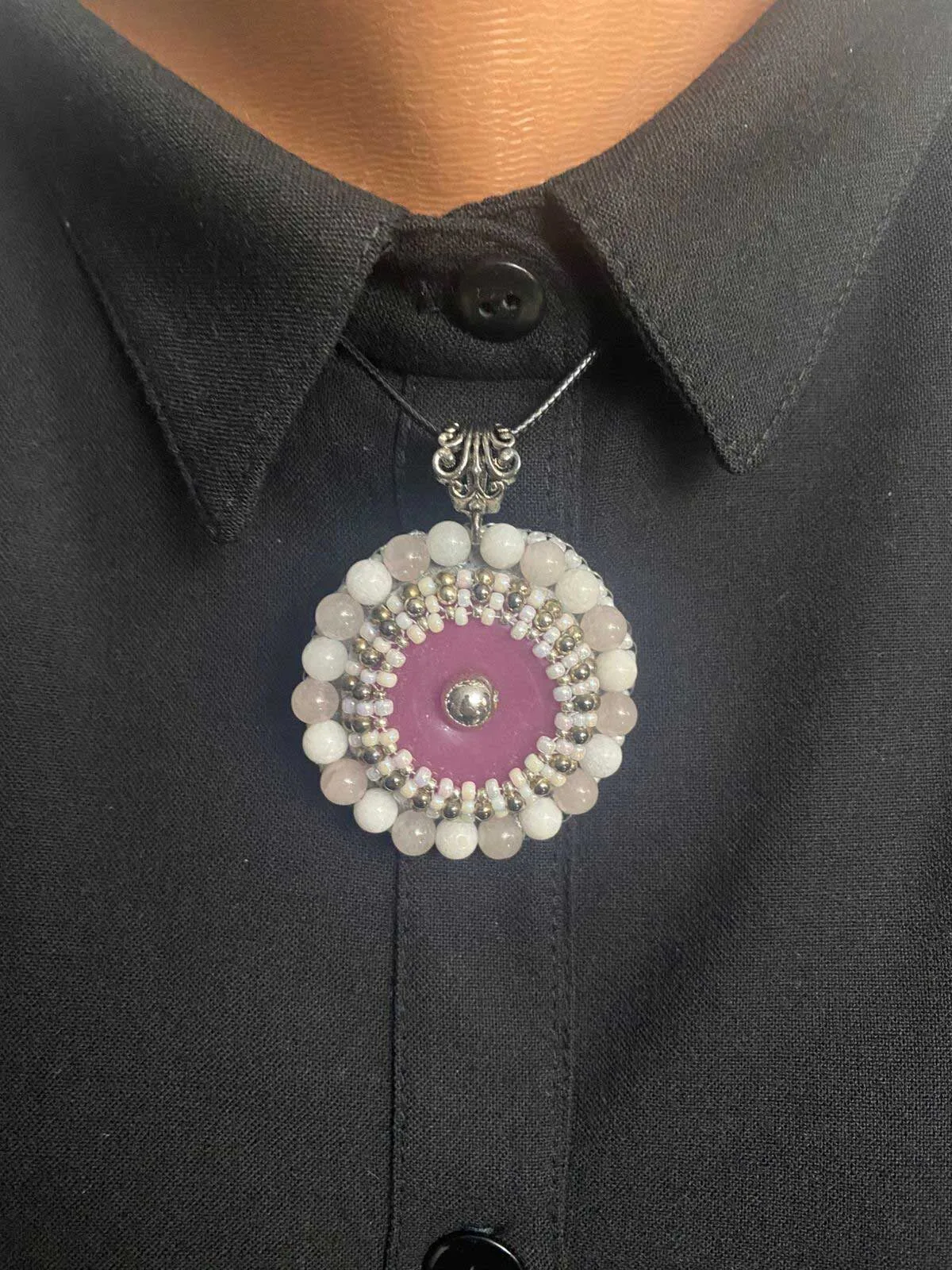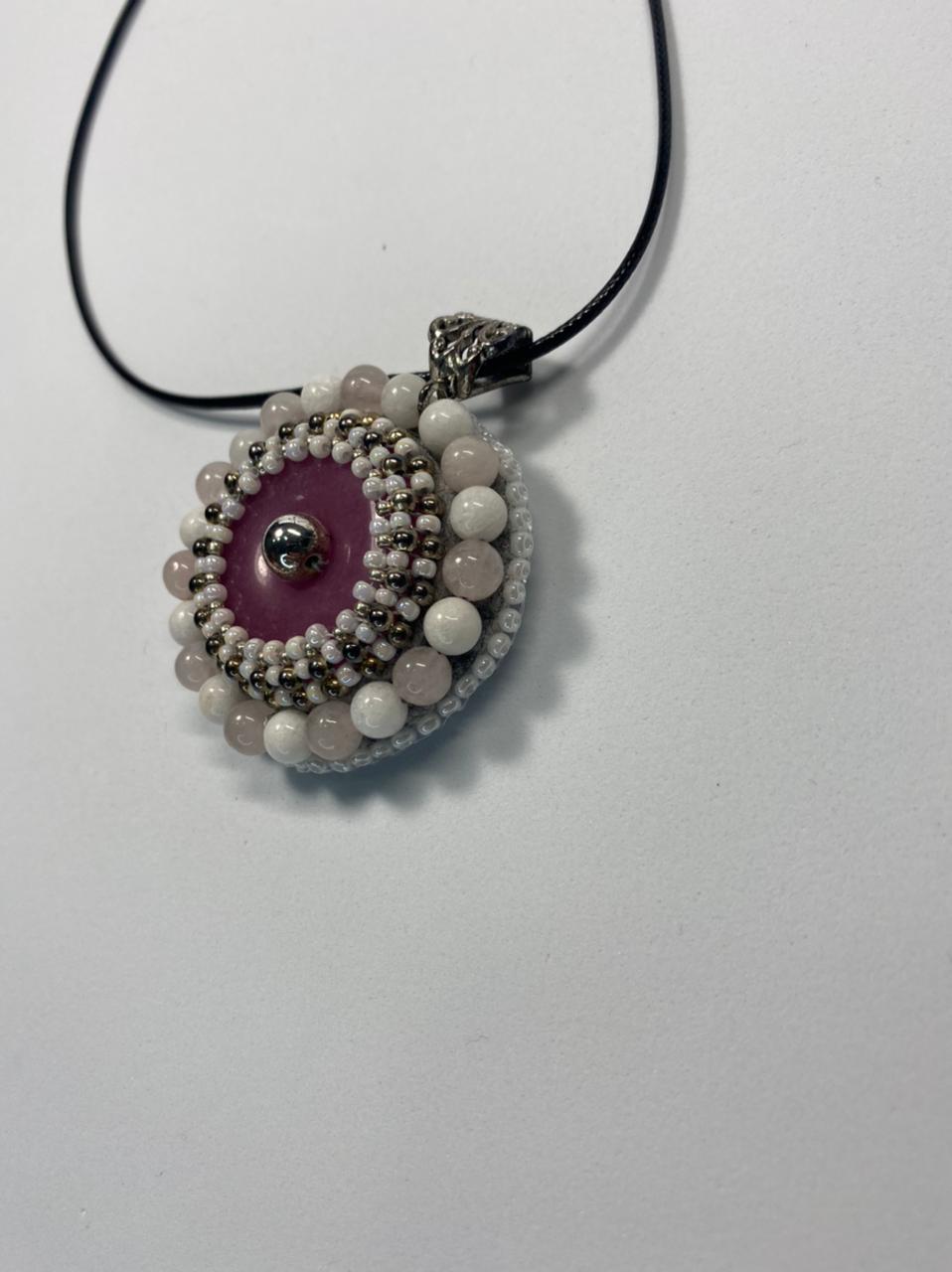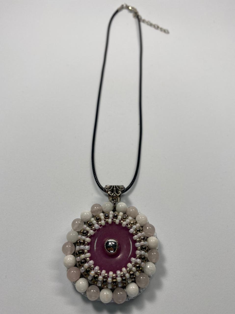 კულონის მასალა: ვარდისფერი ხალცედონი, ვერცხლისფერი ჰემატიტი, ვარდისფერი კვარცი, თეთრი ხალცედონი, იაპონური ბისერი, თეთრი ტყავი, ვერცხლისფერი ფურნიტურა.