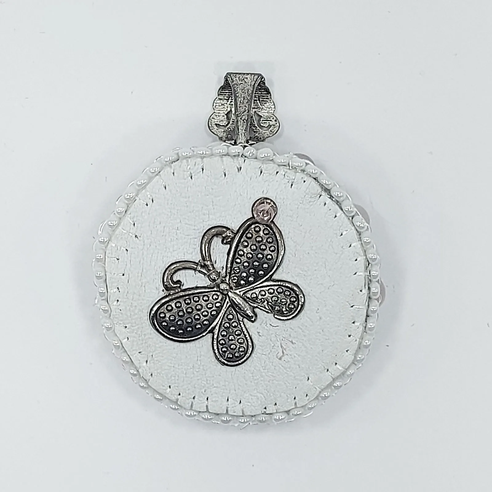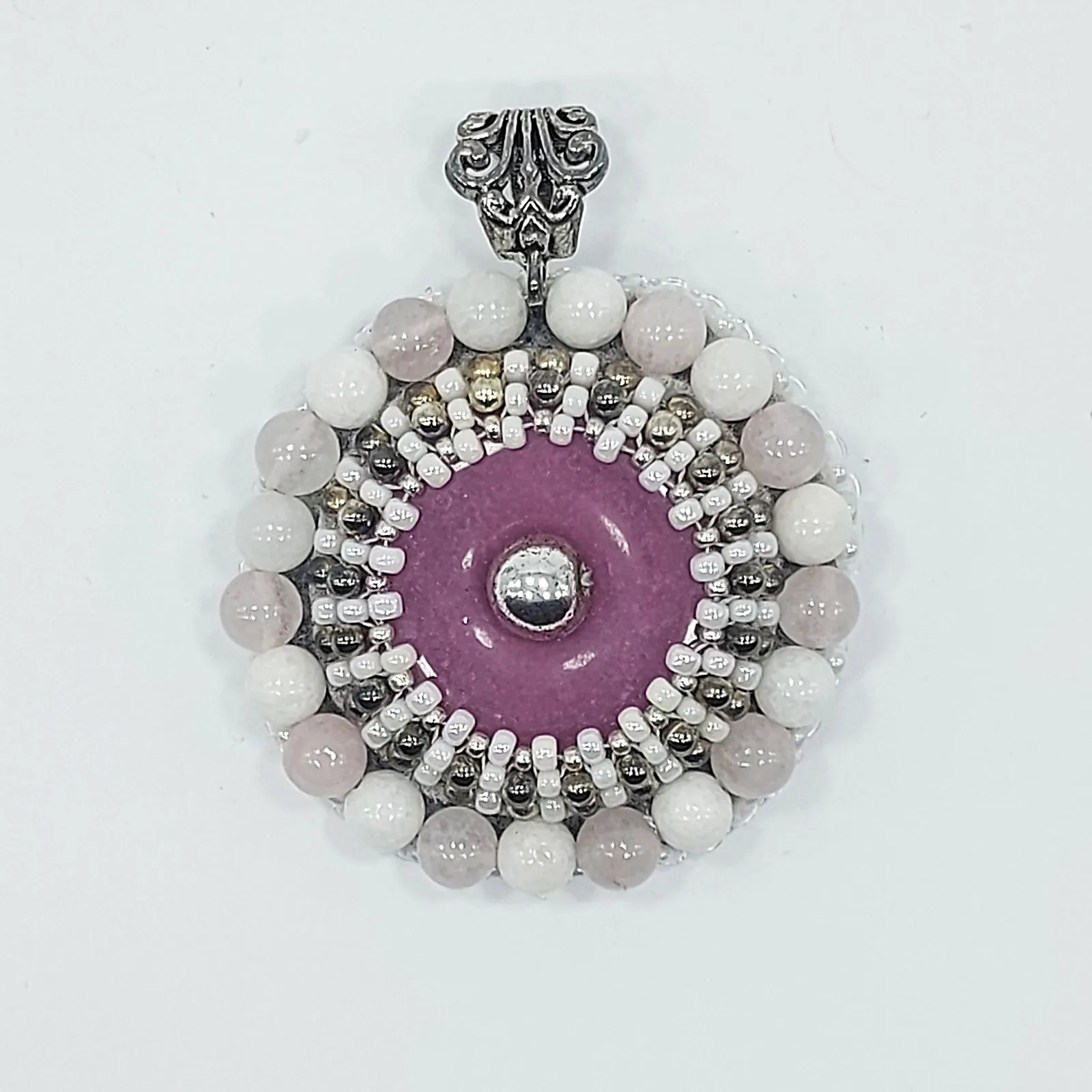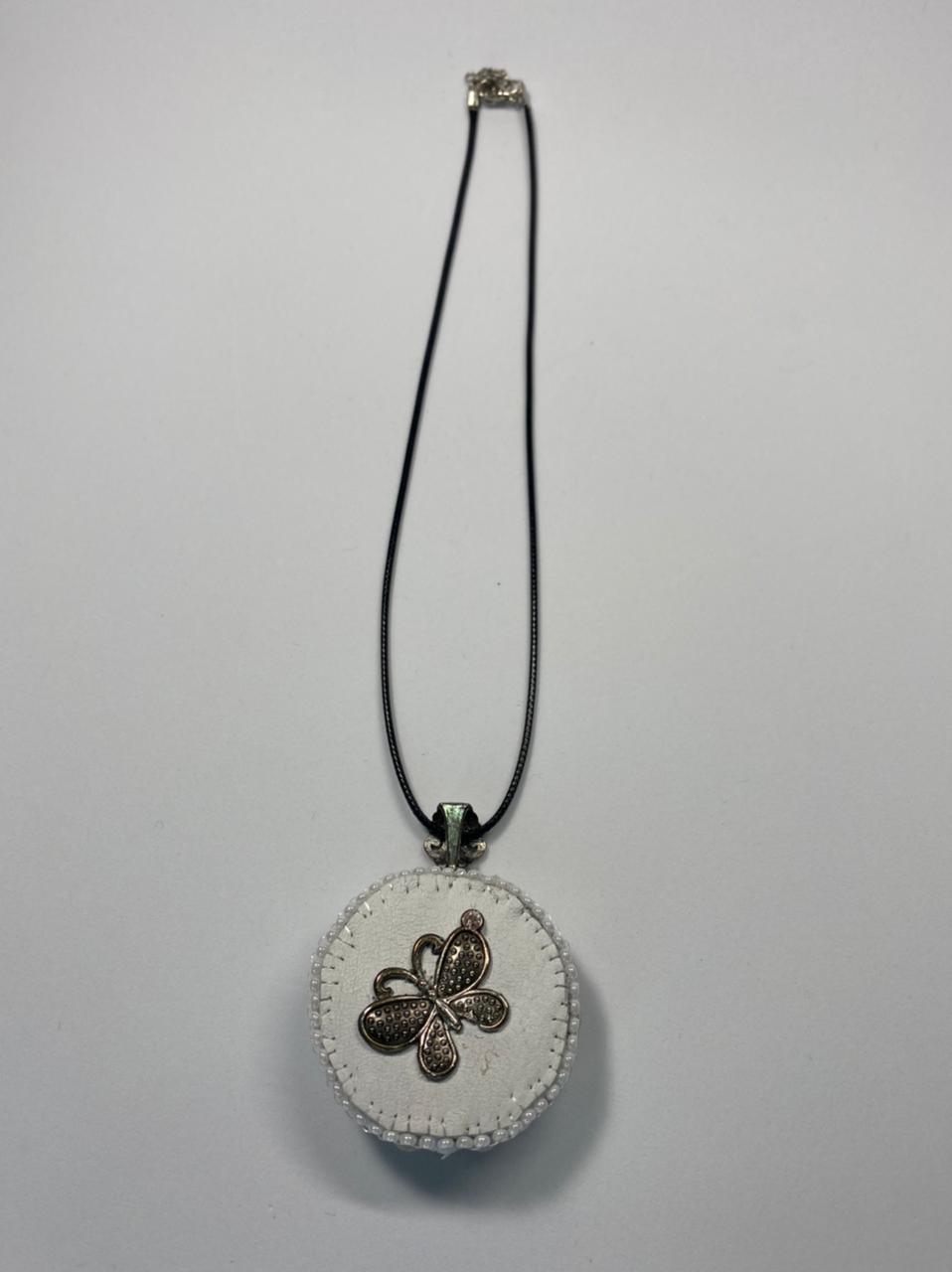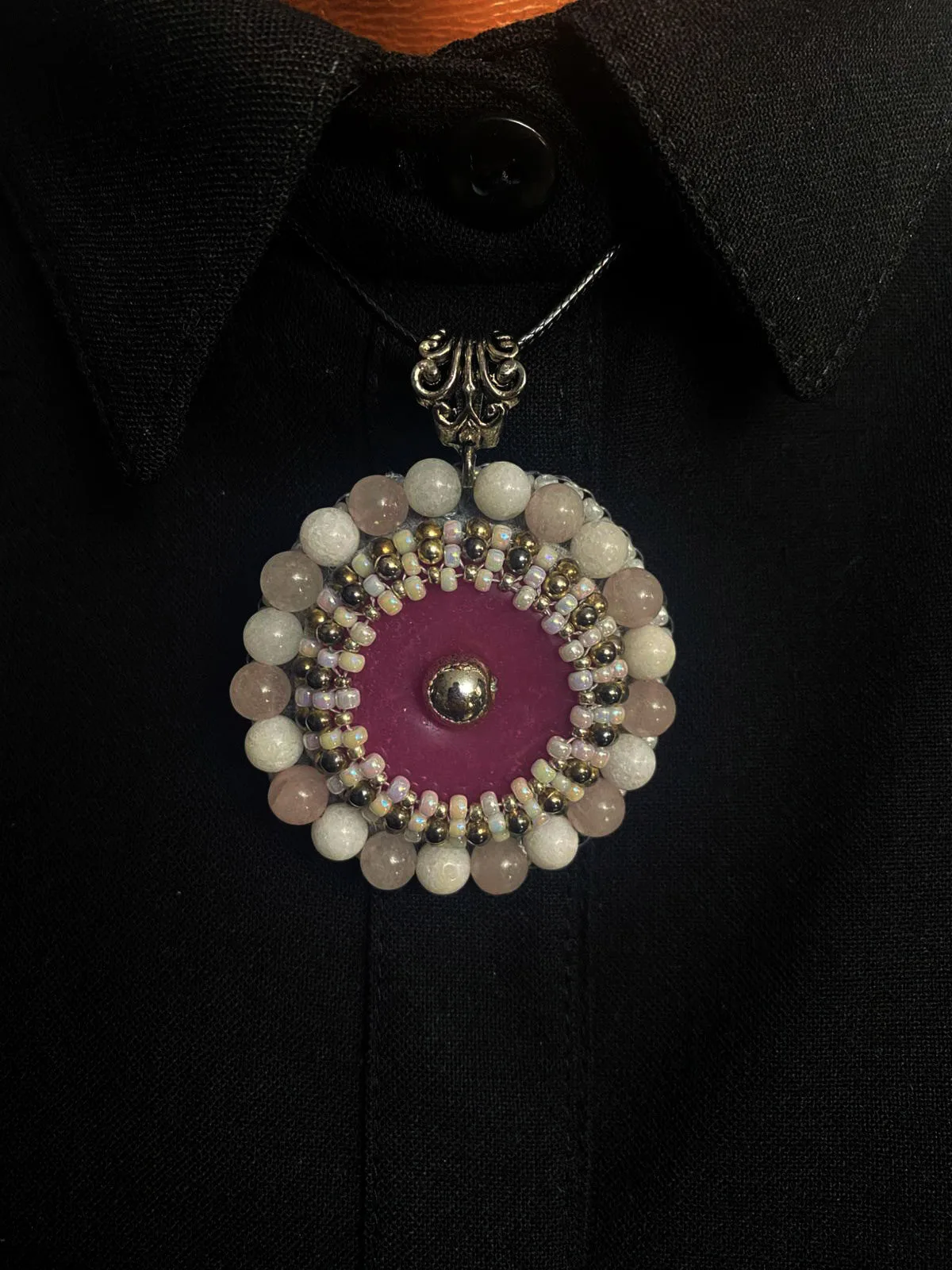 კულონის მასალა: ვარდისფერი ხალცედონი, ვერცხლისფერი ჰემატიტი, ვარდისფერი კვარცი, თეთრი ხალცედონი, იაპონური ბისერი, თეთრი ტყავი, ვერცხლისფერი ფურნიტურა.