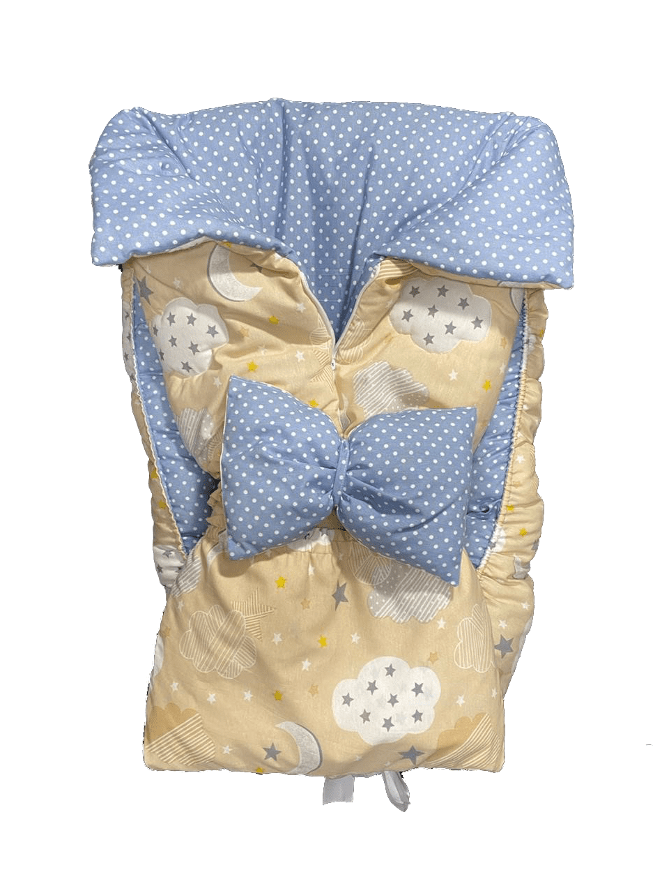მასალა: კოტონი, შემავსებელი მასალა – სინტიპონი და ფლაიბერი. ზომები: საბანი-კონვერტი – 90/80 სმ; ბალიში – 25/15 სმ; ბუდე – 80/53 სმ.