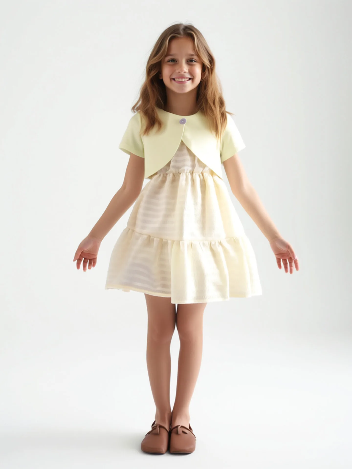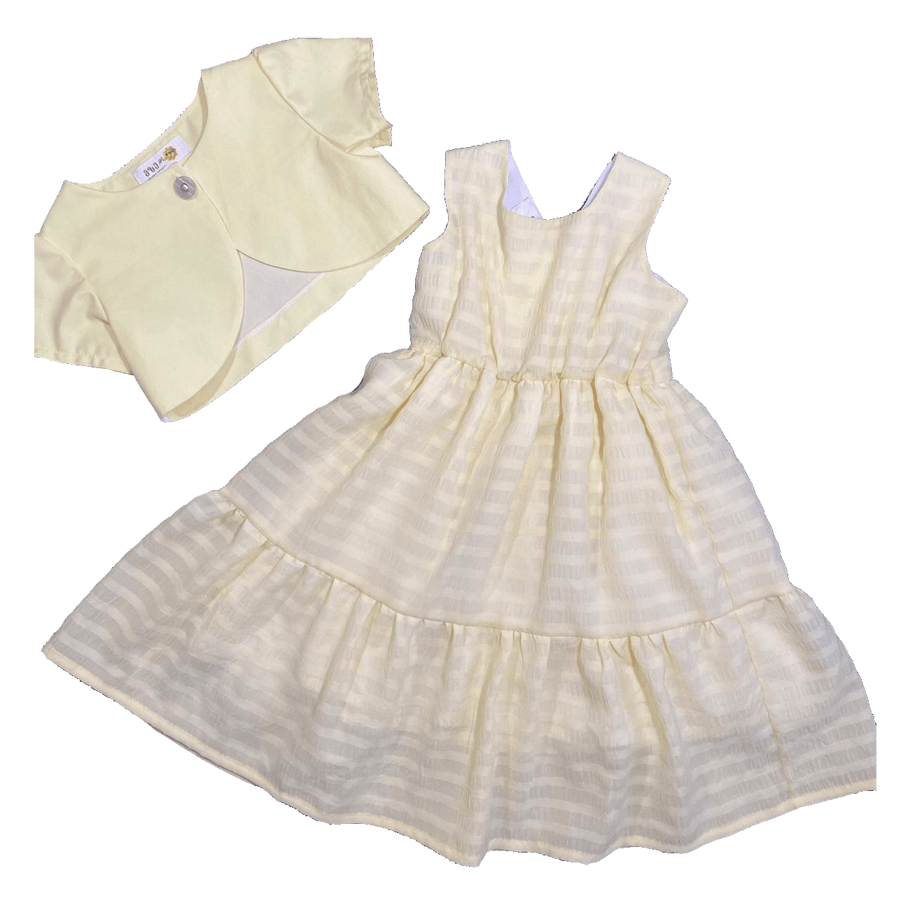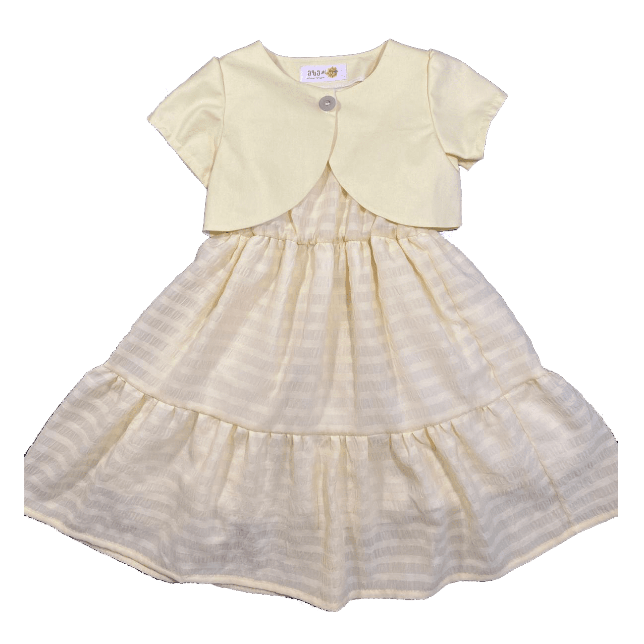 მასალა: კაბა – მუსლინი (ბამბის და აბრეშუმის ნარევი), სარჩული – ბატისტი, ბოლერო – დენიმი (კოტონის და ელასტინის ნარევი).