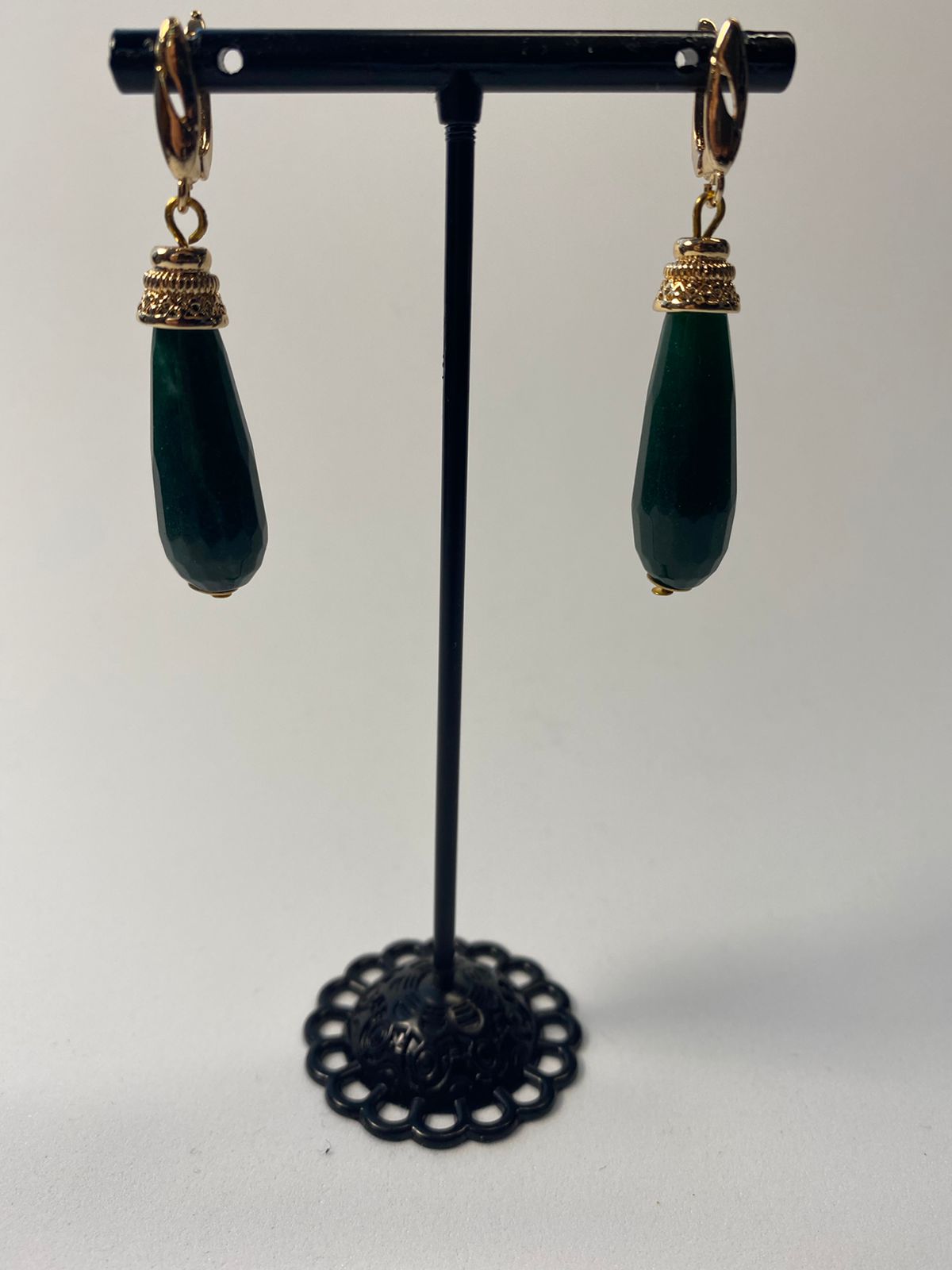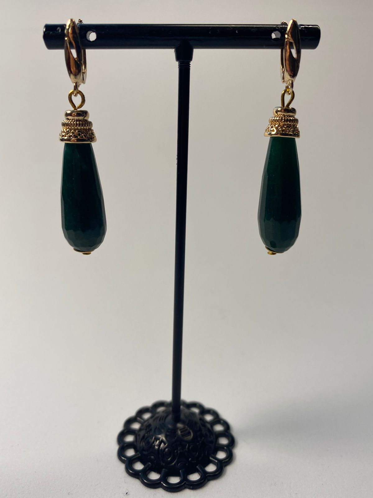 მასალა: მწვანე, ცრემლისებური ფორმის ხალცედინი; ფურნიტურა და ინგლისური სტილის საყურის შესაკრავი ანტიალერგიული ოქროსფერი მეტალი.