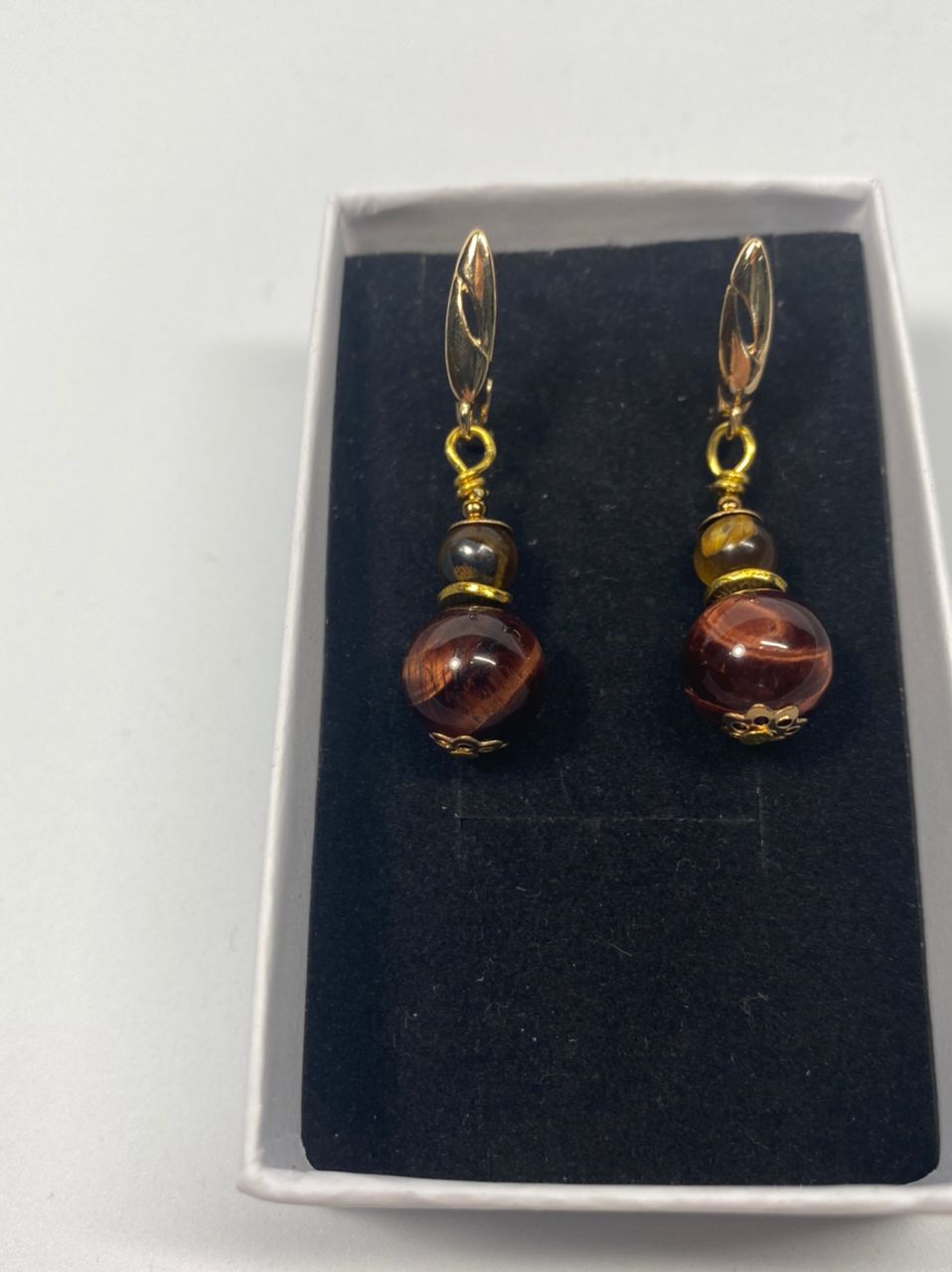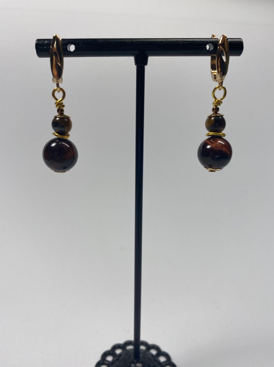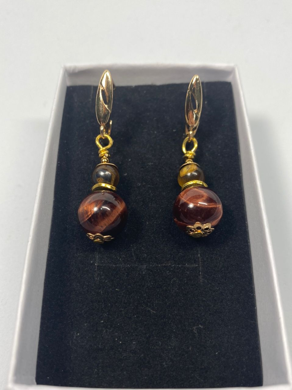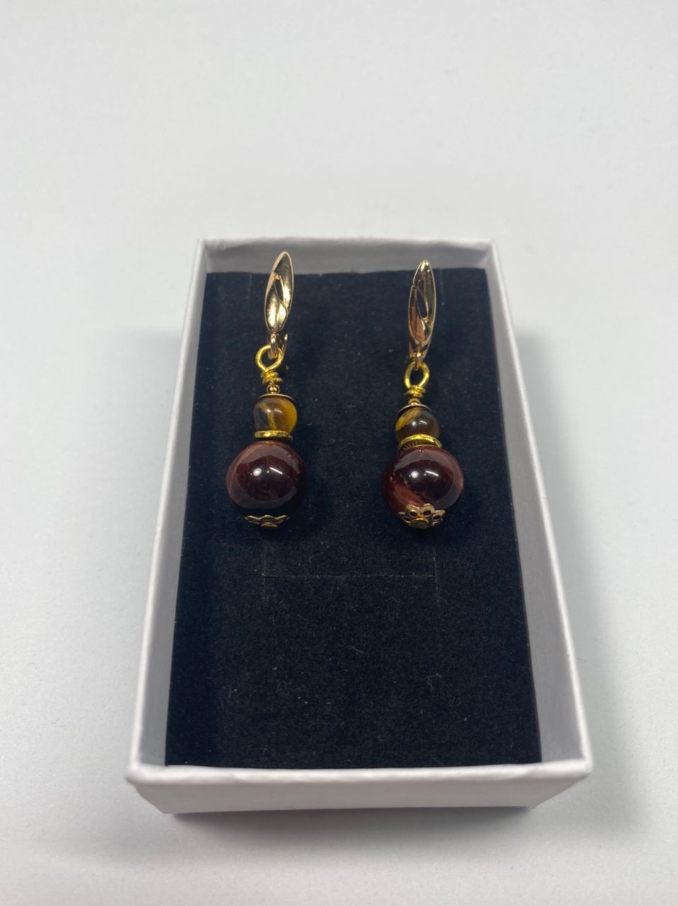 მასალა: ბორდო კატის თვალი, ვეფხვის თვალი, ფურნიტურა და ინგლისური სტილის საყურის შესაკრავი ანტიალერგიული ოქროსფერი მეტალი.