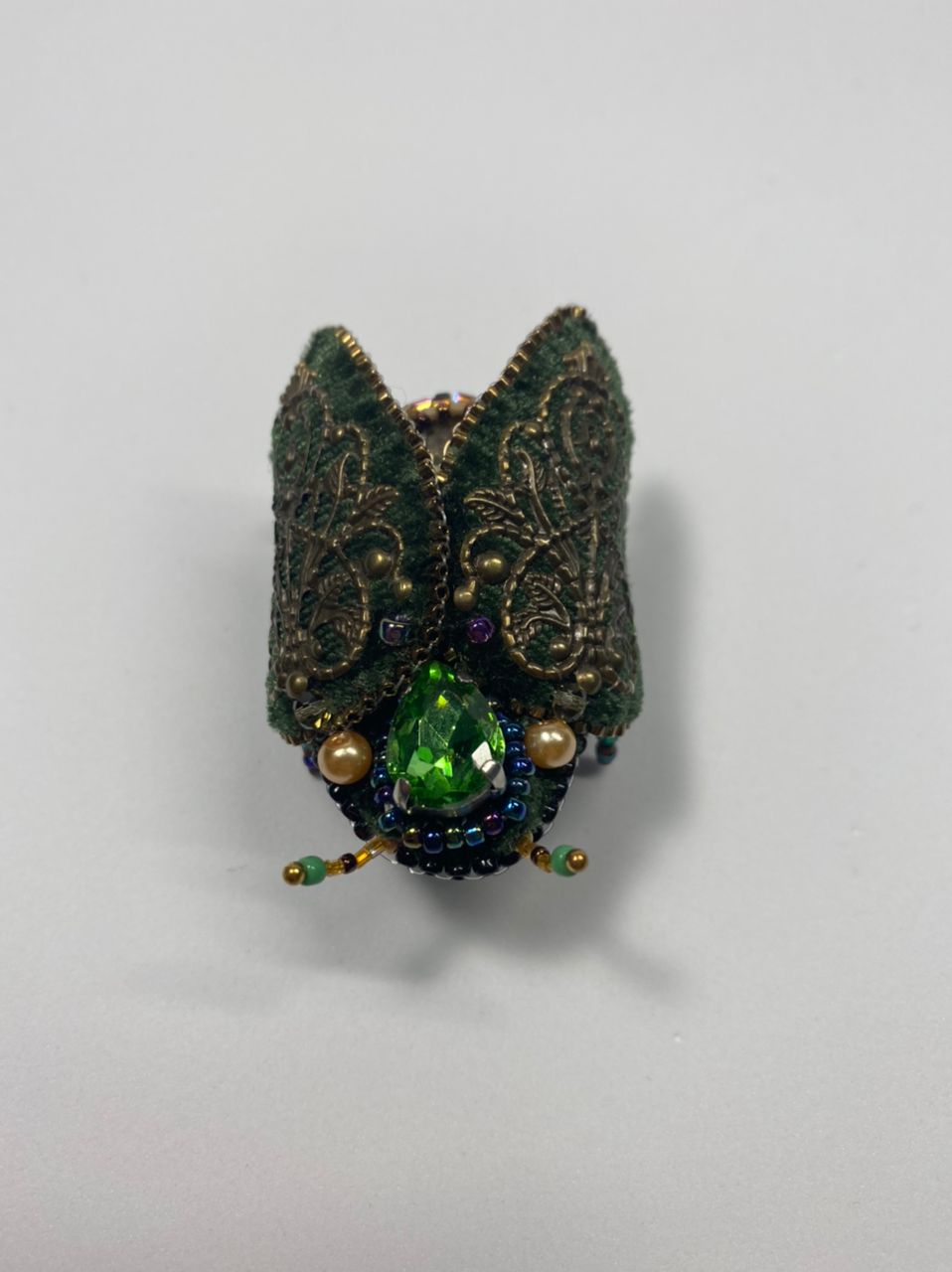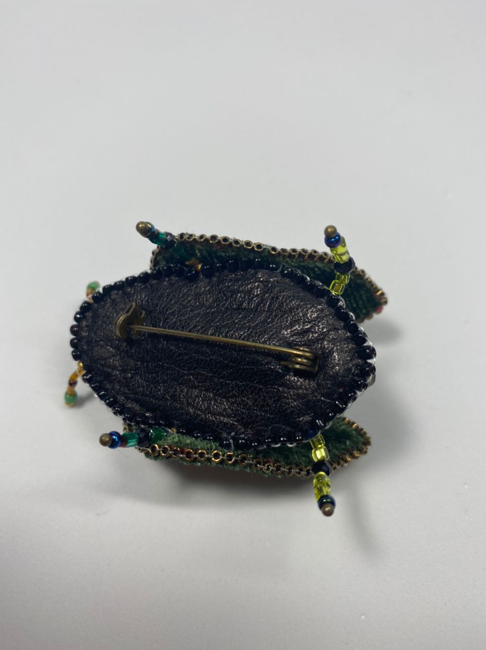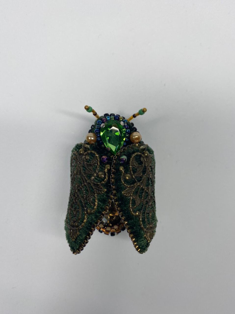 მწვანე, მოცულობითი, ხელნაკეთი ხოჭო – ბროში.