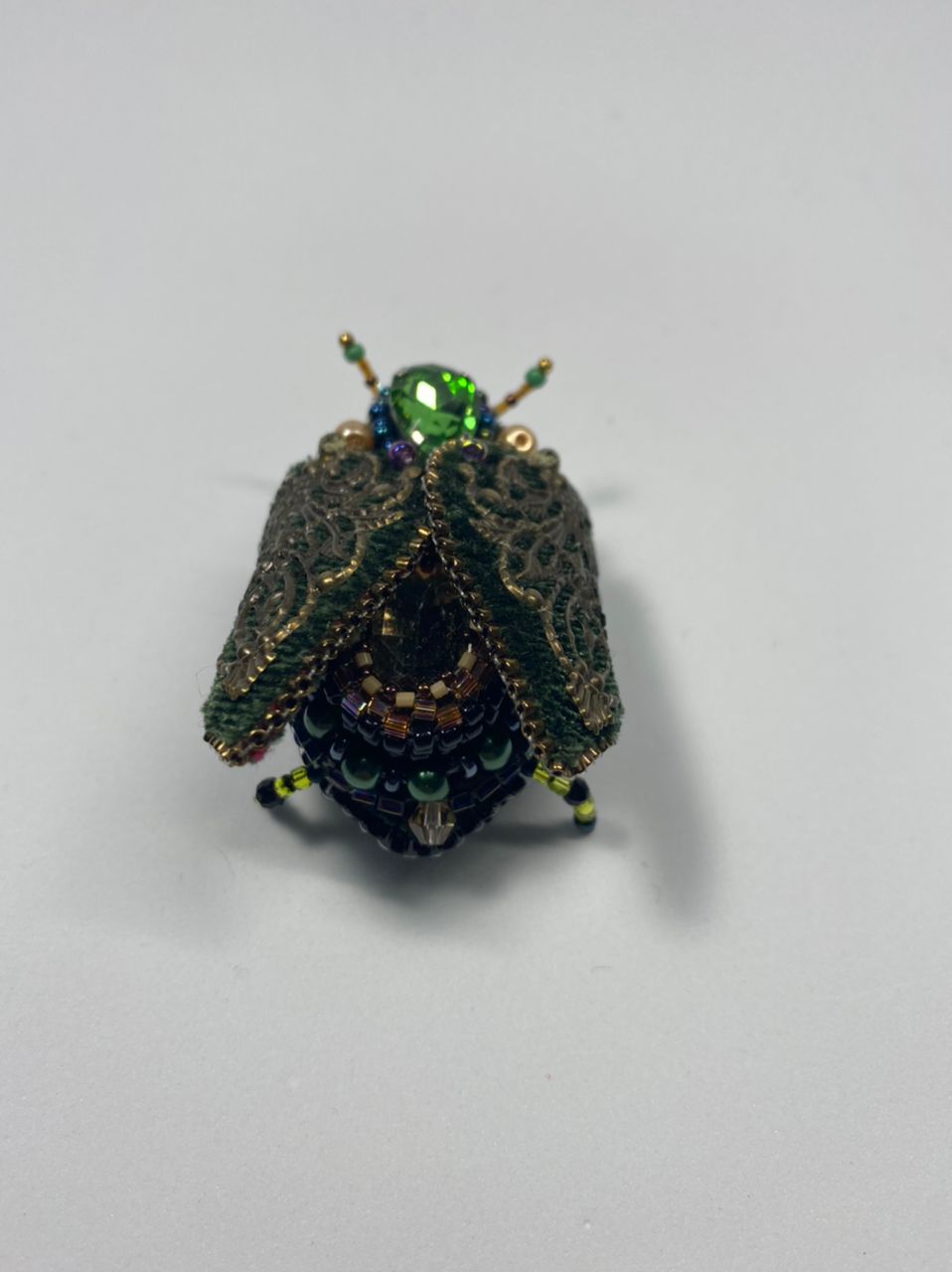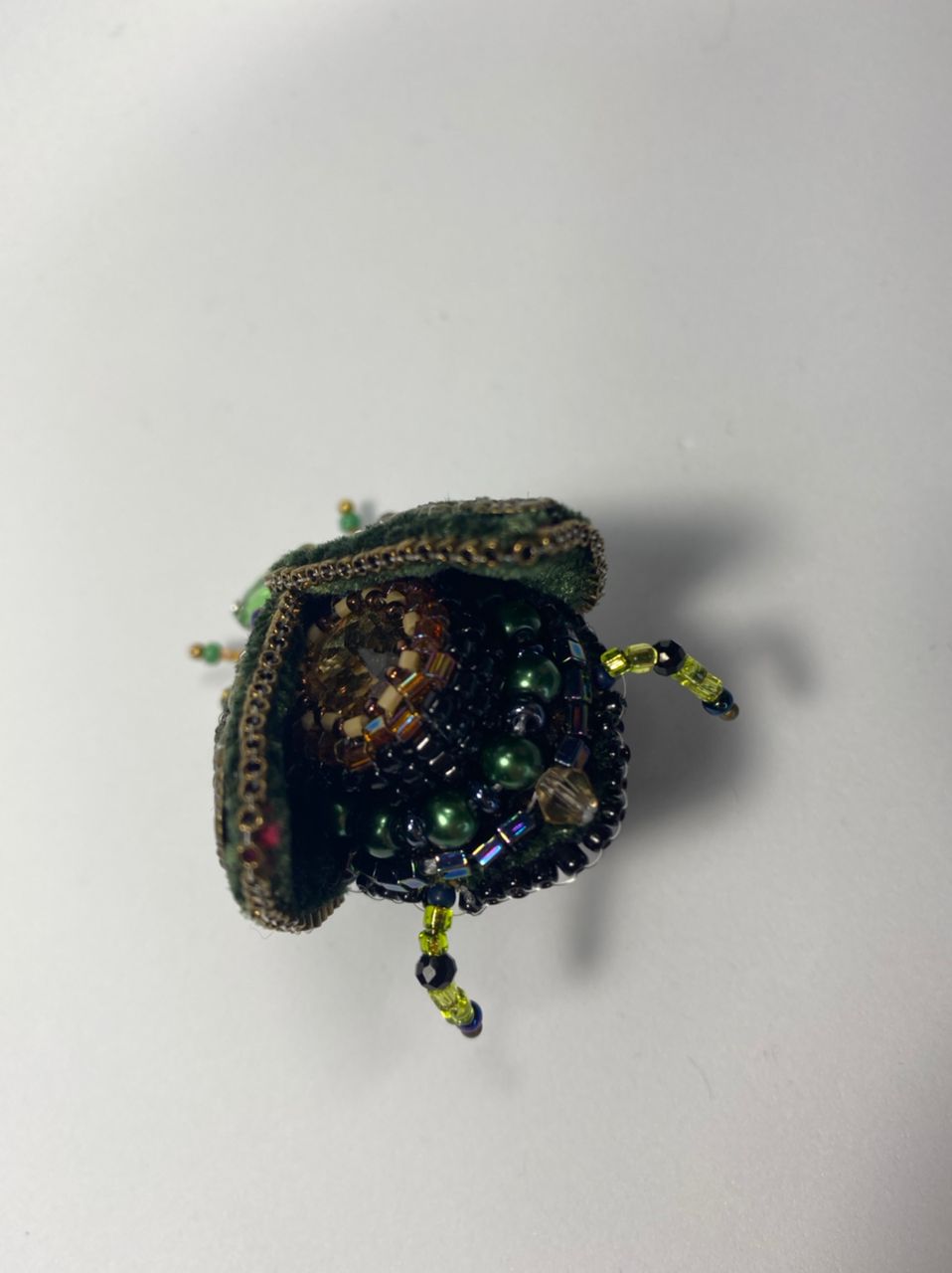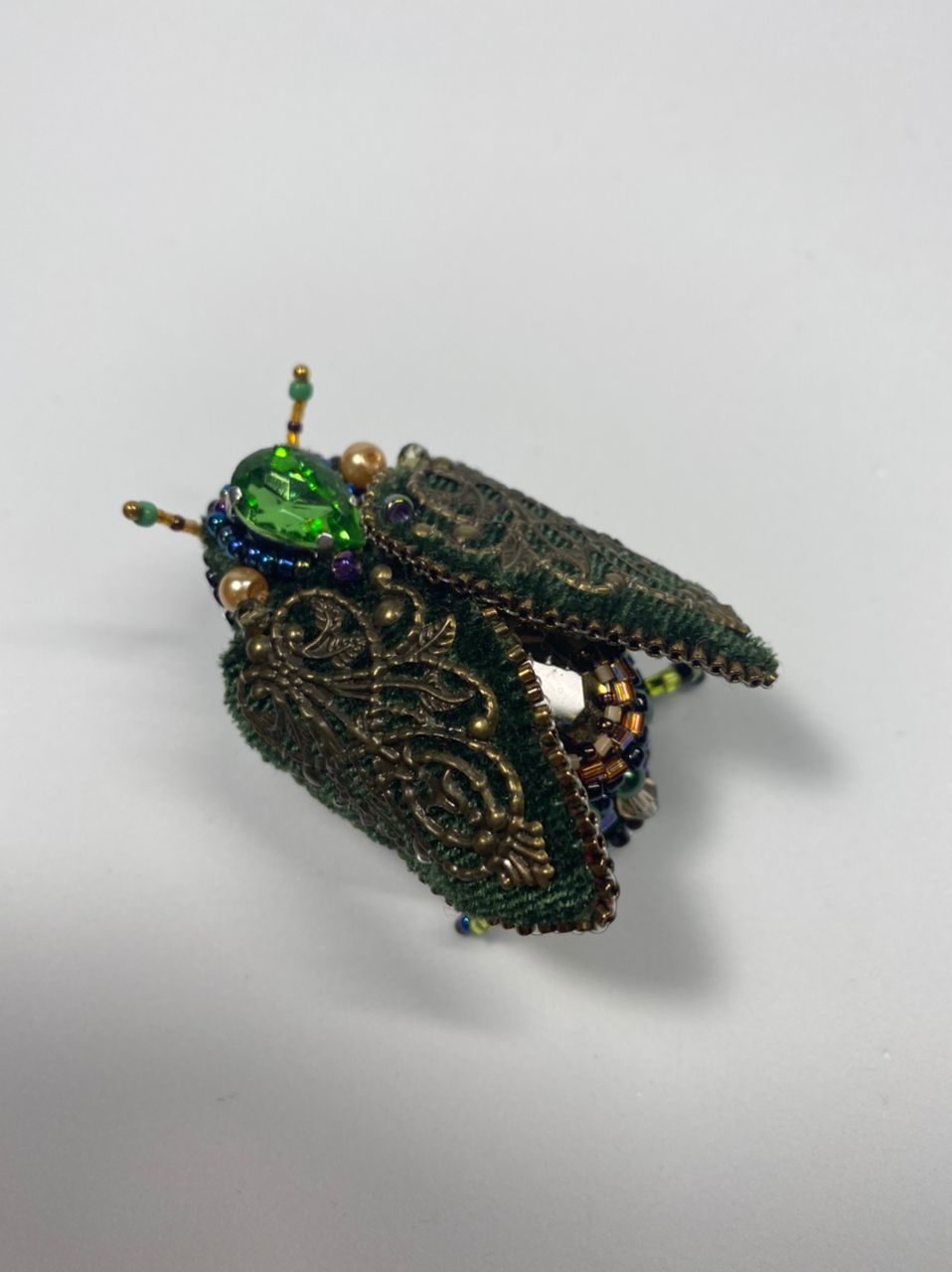 ხოჭო – ბროშის მასალა: ჩეხური ბროლო, ჩეხური მძივი, იაპონირი ბისერი, ხავერდი, ტყავი, ბრინჯაოსფერი ფილიგრანი და ფურნიტურა.