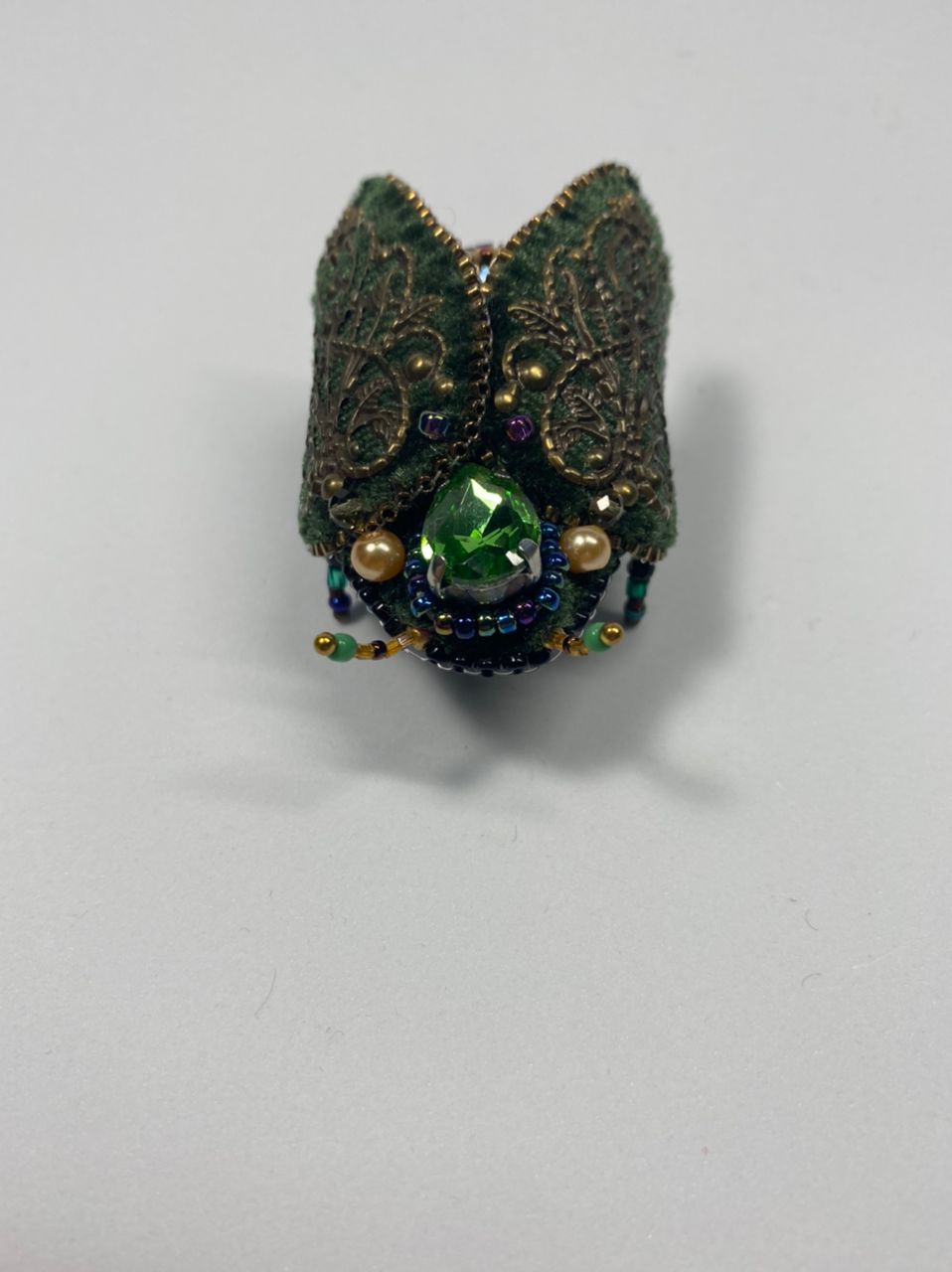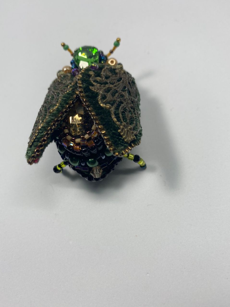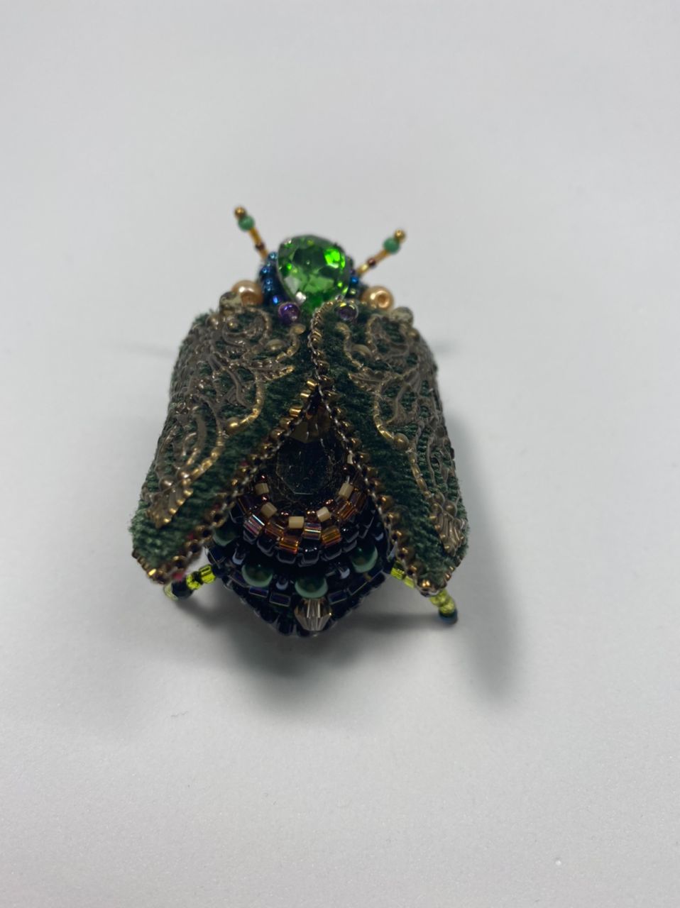 ხოჭო – ბროშის მასალა: ჩეხური ბროლო, ჩეხური მძივი, იაპონირი ბისერი, ხავერდი, ტყავი, ბრინჯაოსფერი ფილიგრანი და ფურნიტურა.