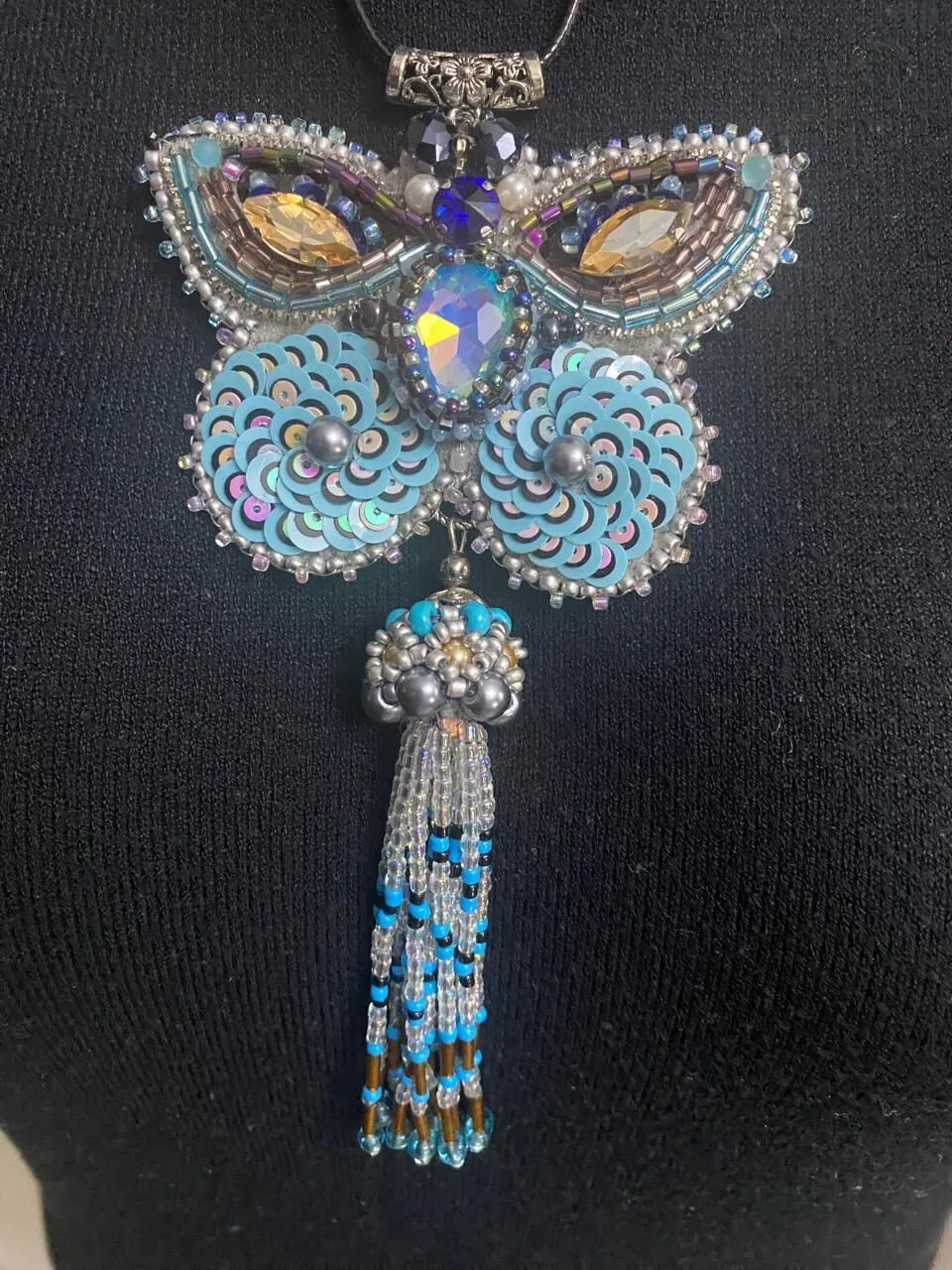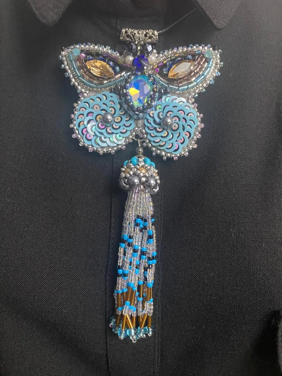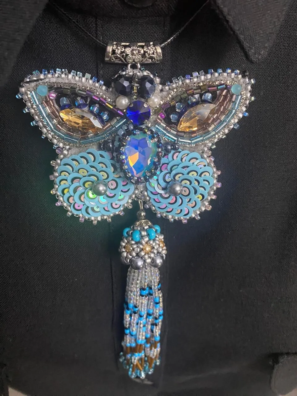 კულონის მასალა: ჩეხური შუშა, ავსტრიული ბროლი, იაპონური ბისერი, ფრანგული ფარფლები (პაიეტკები), ლურჯი ეკო-ზამში და ბრინჯაოსფერი ფილიგრანი (პეპელას ზურგი)