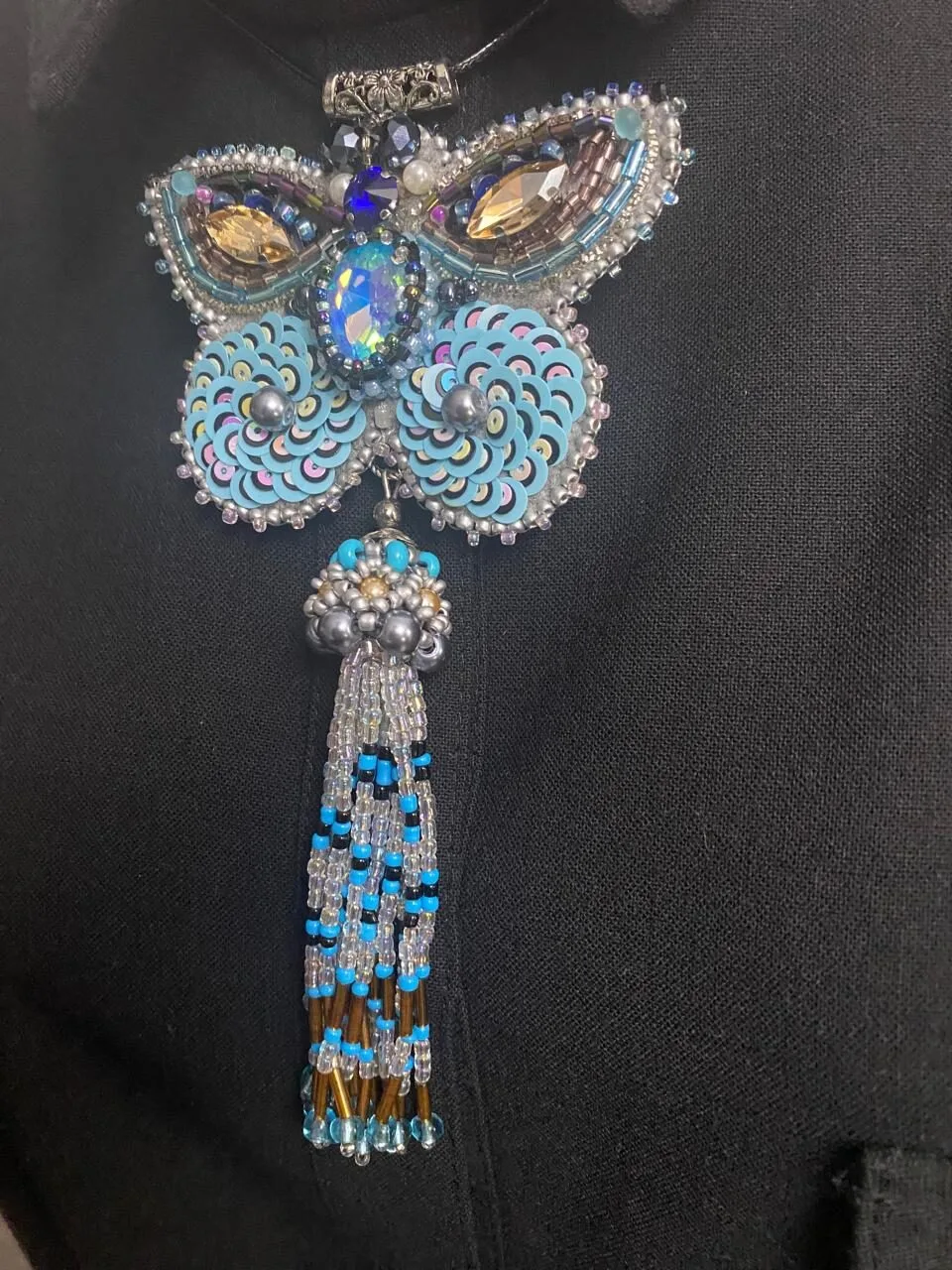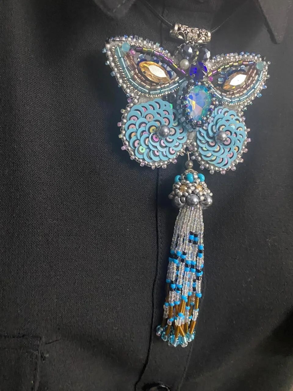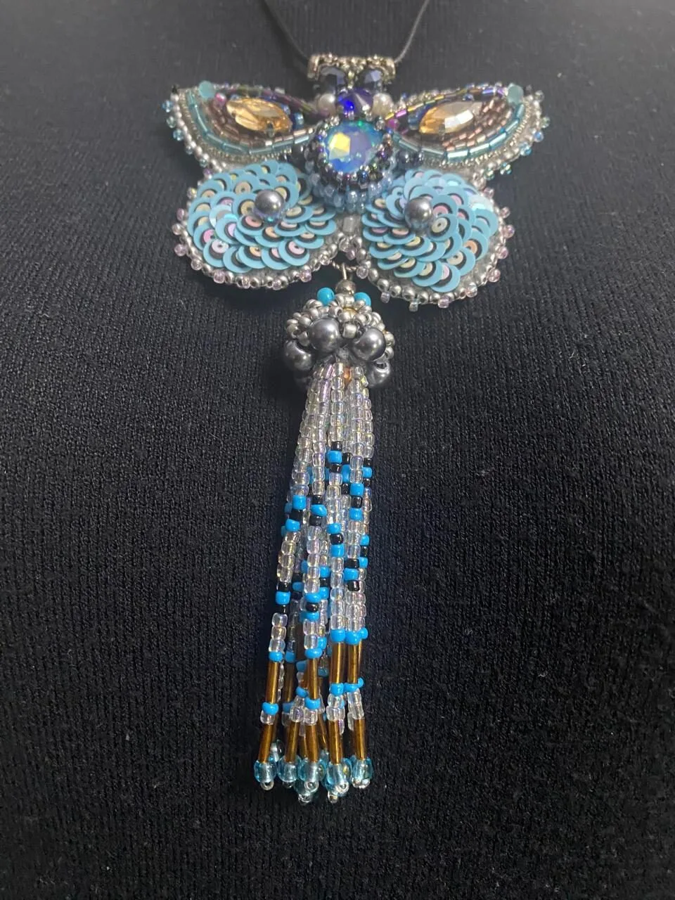 კულონის მასალა: ჩეხური შუშა, ავსტრიული ბროლი, იაპონური ბისერი, ფრანგული ფარფლები (პაიეტკები), ლურჯი ეკო-ზამში და ბრინჯაოსფერი ფილიგრანი (პეპელას ზურგი)