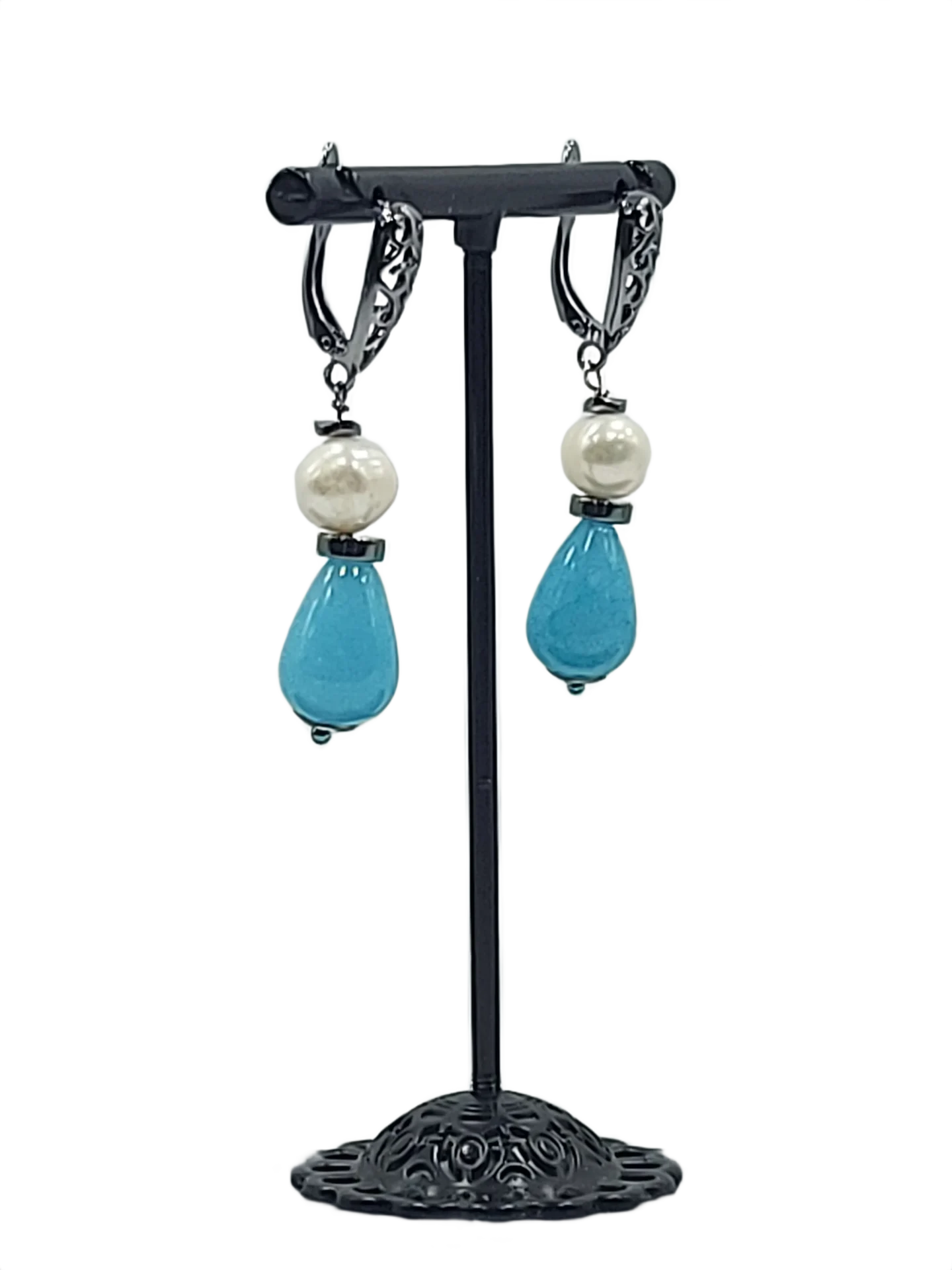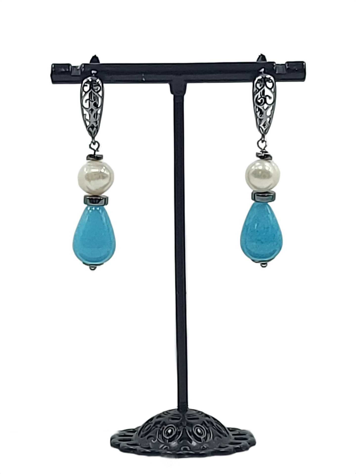 მასალა: ამაზონიტი, თეთრი მდინარის მარგალიტი, ჰემატიტის დისკი, შავი ფერის მეტალის უჟანგავი ფურნიტურა და ანტიალერგიული, ინგლისური სტილის საყურის შესაკრავი.
