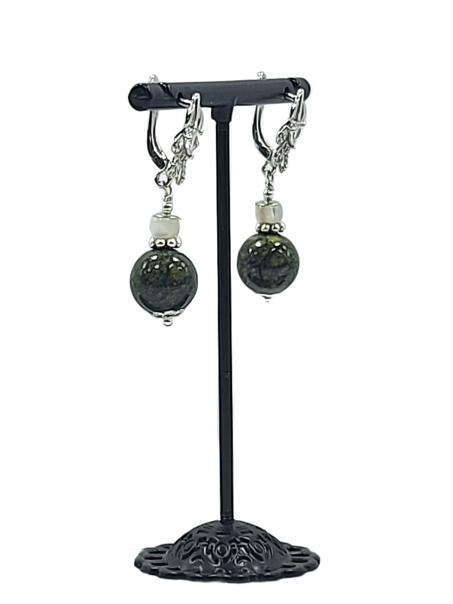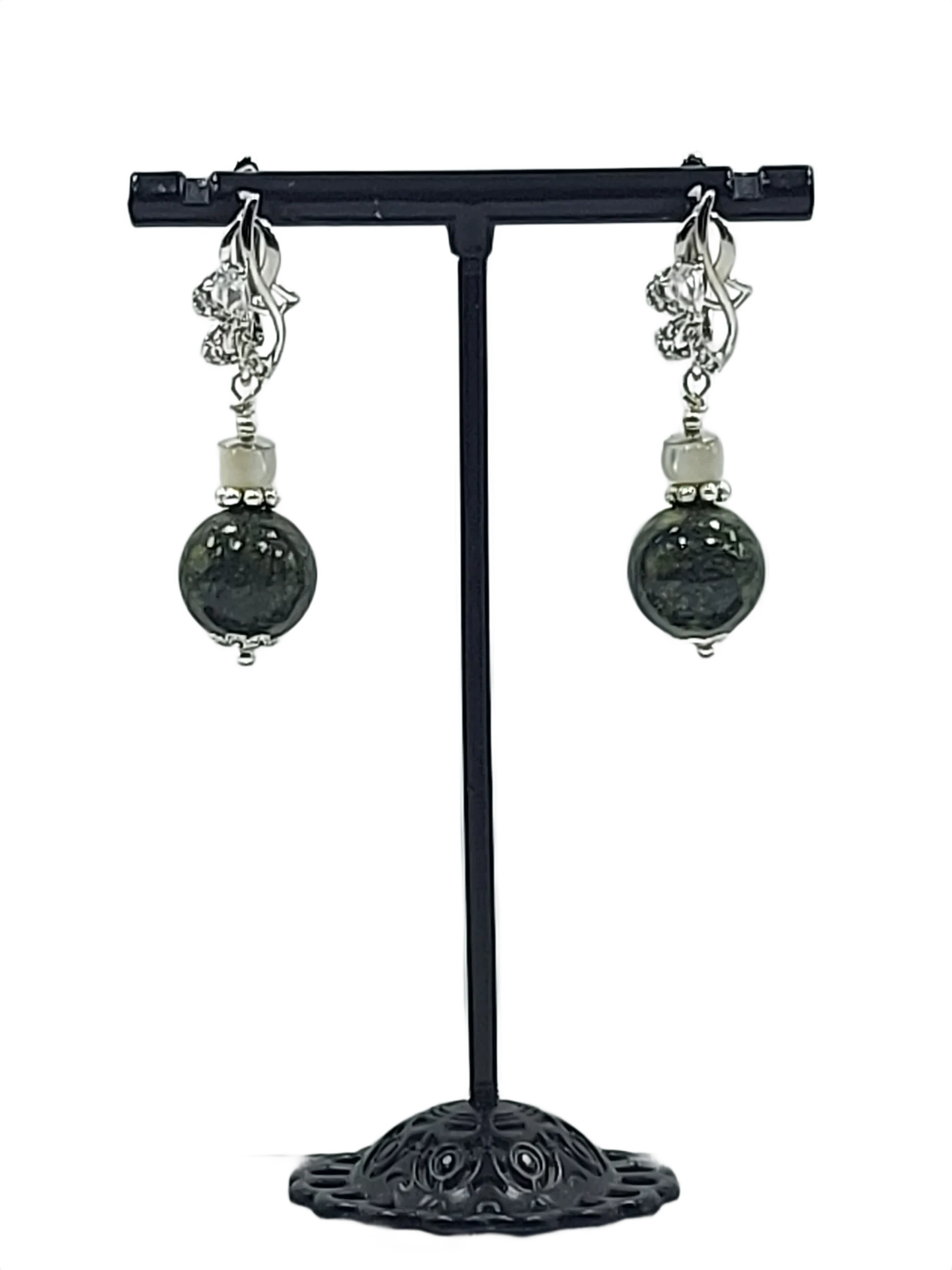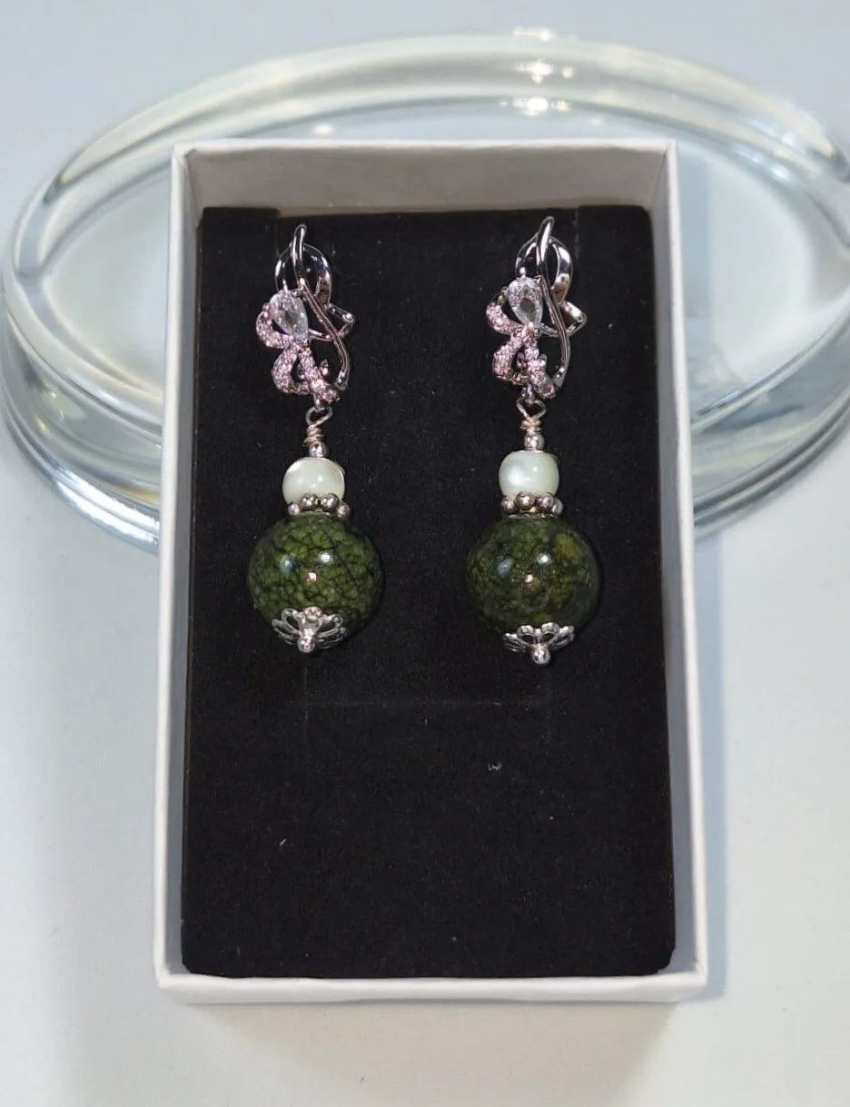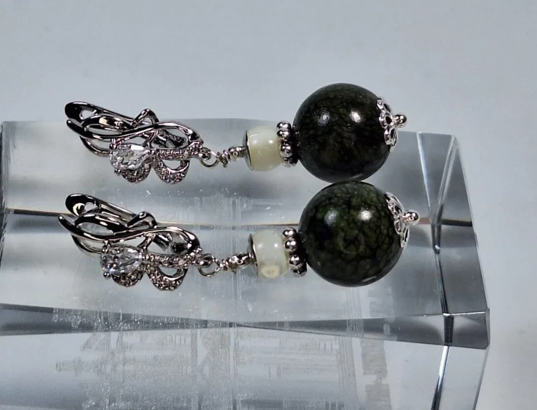 მასალა: გველის ქვა ( მწვანე იასპი), თეთრი სადაფის დისკი, ვერცხლისფერი უჯანგავი ფურნიტურა, ანტიალერგიული და საფირებით გაწყიბილი ინგლისური სტილის შესაკრავი.