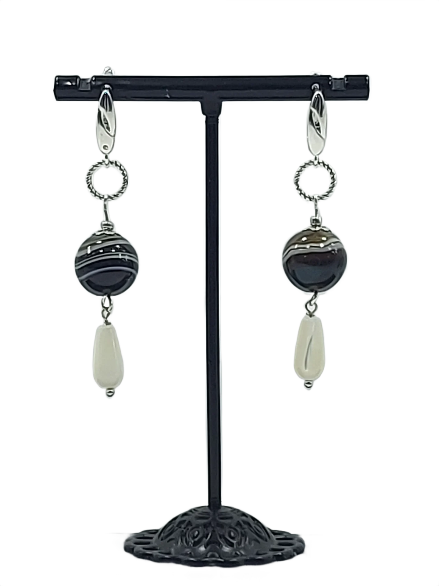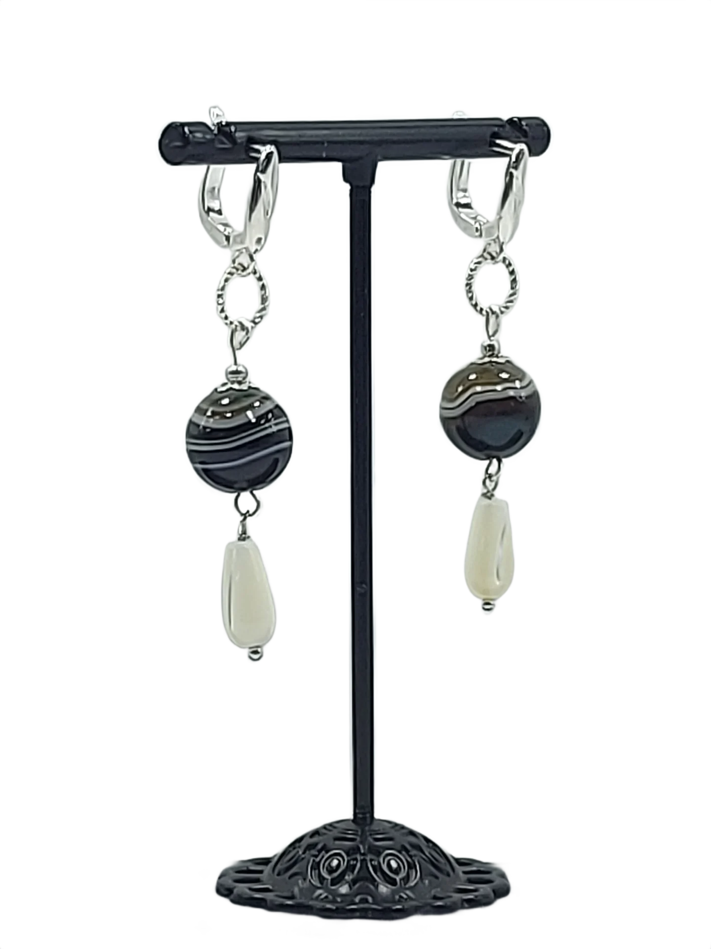 მასალა: მწვანე ზოლიანი აგატი, სადაფი, ვერცხლისფერი უჟანგავი ფურნიტურა და ინგლისური სტილის შესაკრავი.