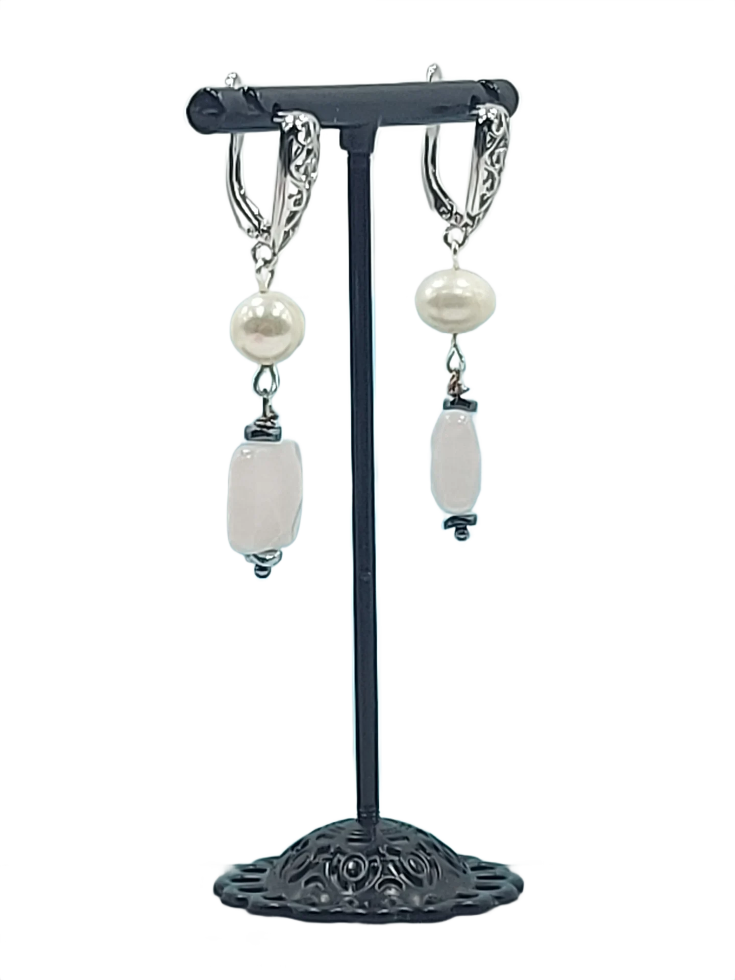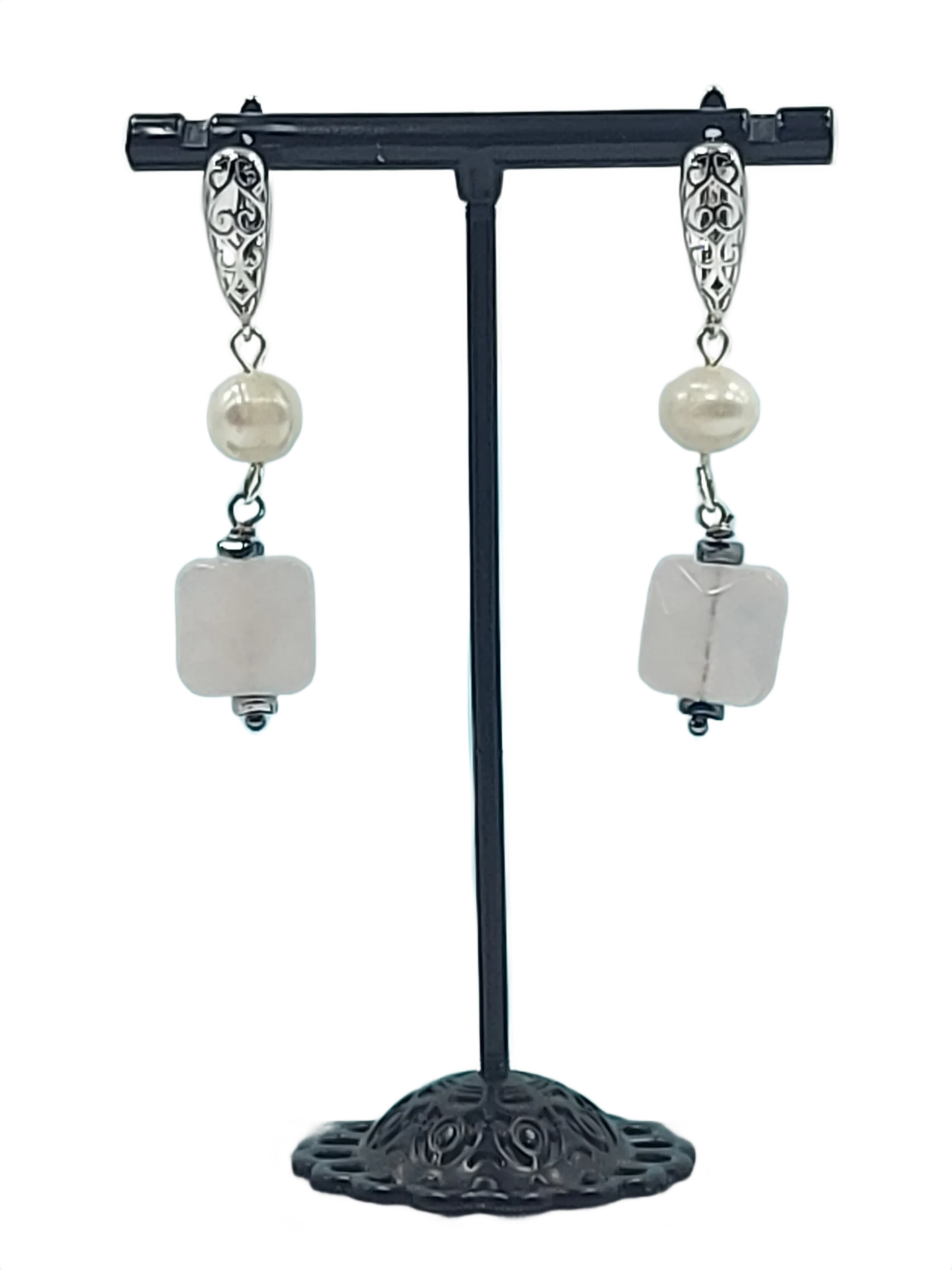 მასალა: თეთრი მდინარის მარგალიტი, ვარდისფერი კვადრატის ფორმის კვარცი, ჰემატიტის დისკები, ვერცხლისფერის მეტალის უჟანგავი ფურნიტურა და ანტიალერგიული, ინგლისური სტილის საყურის შესაკრავი.