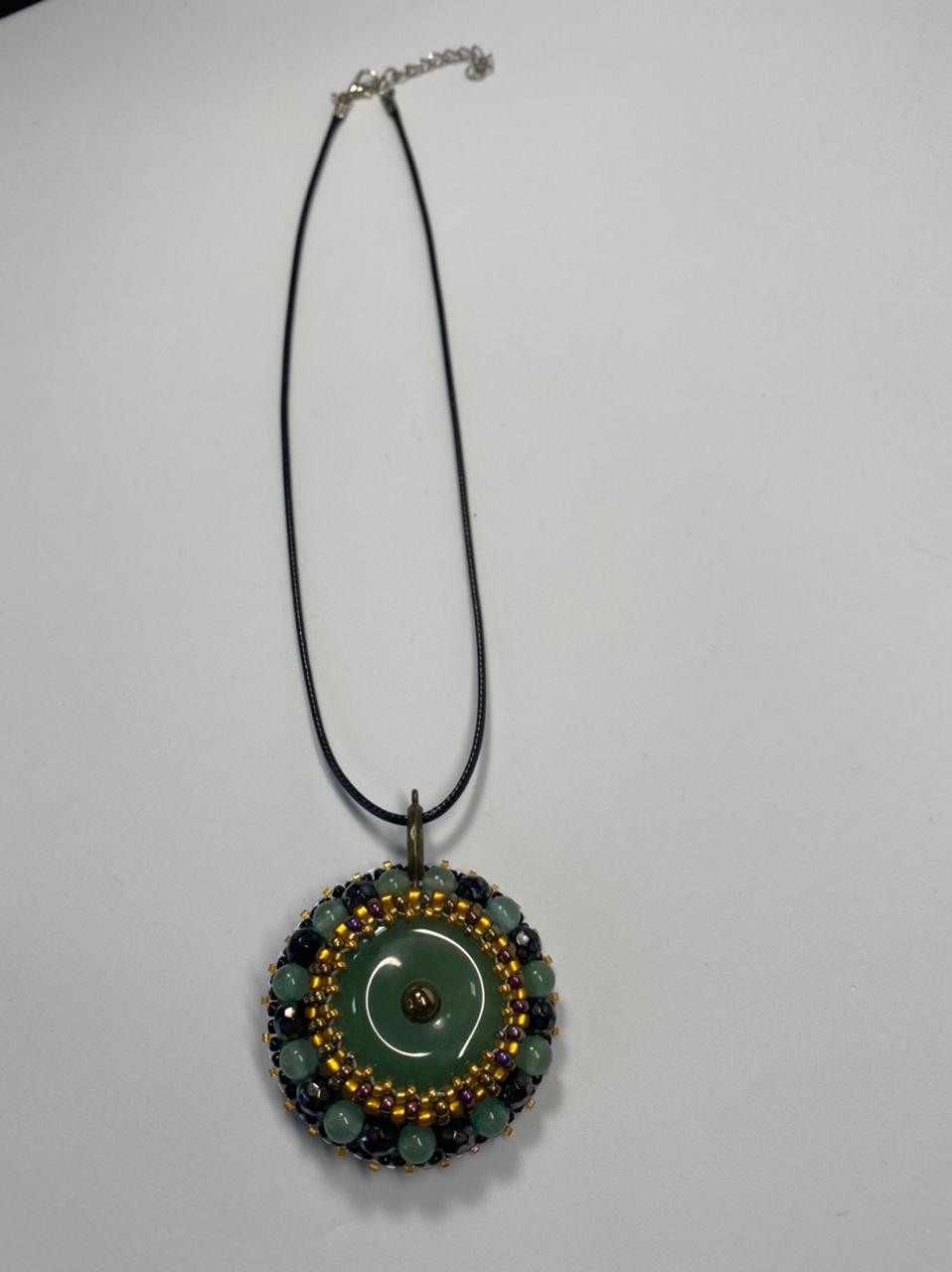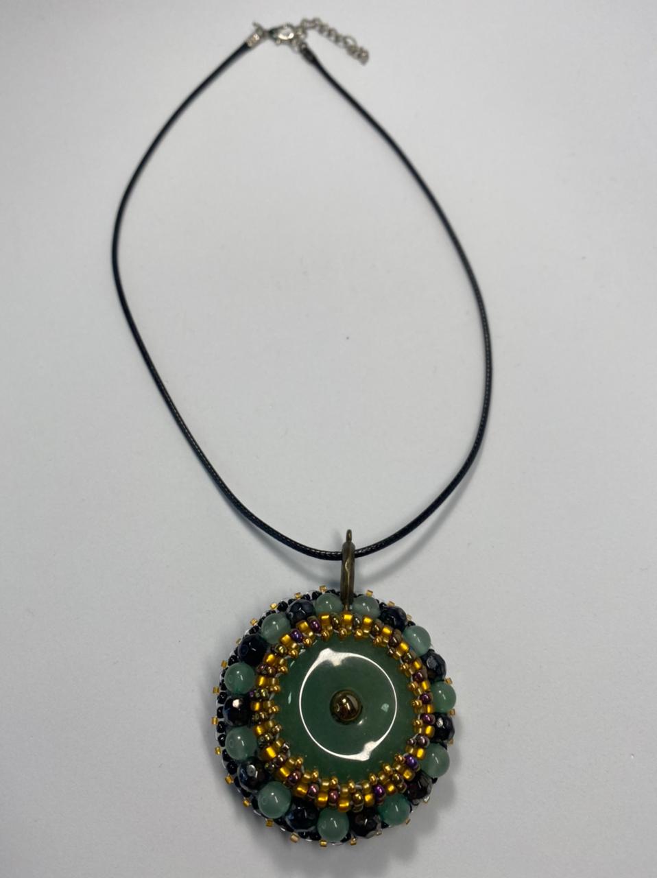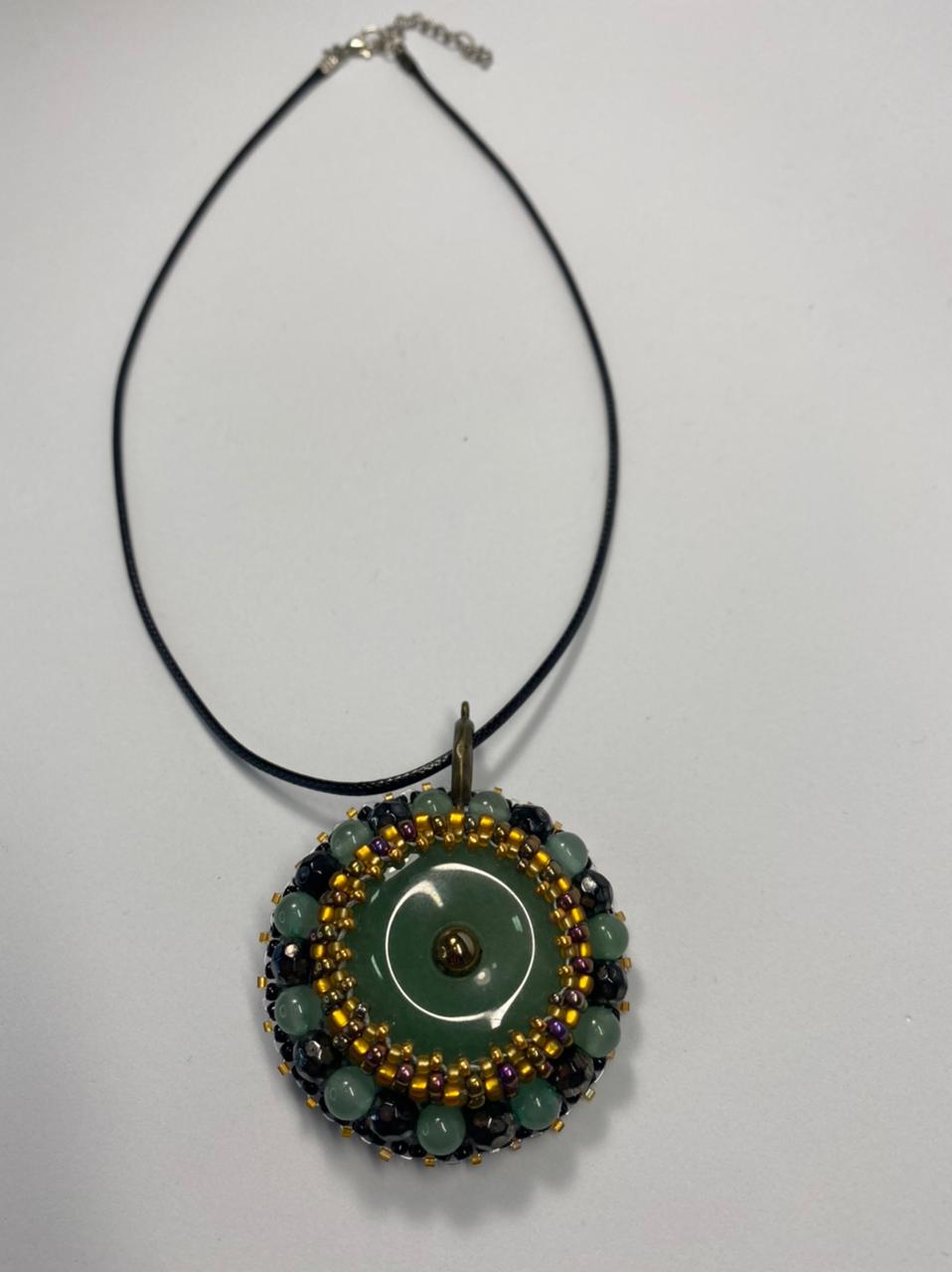დისკო კულონის მასალა: მწვანე ხალცედონის დისკი (დიამერტი 35მმ), მწვანე ამაზონიტი, ჩეხური მძივი, იაპონური ბისერი, ჰემატიტი, ტყავი, ბრინჟაოსფერი ფილიგრანი და ფურნიტურა.