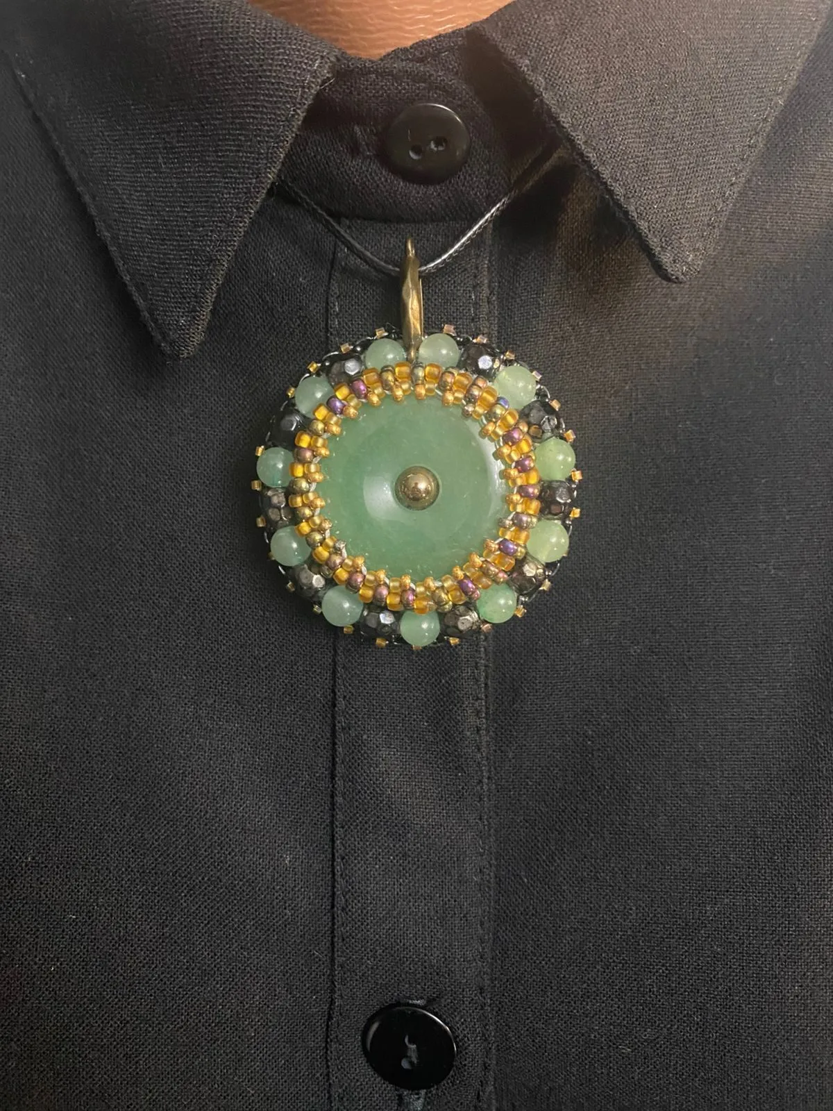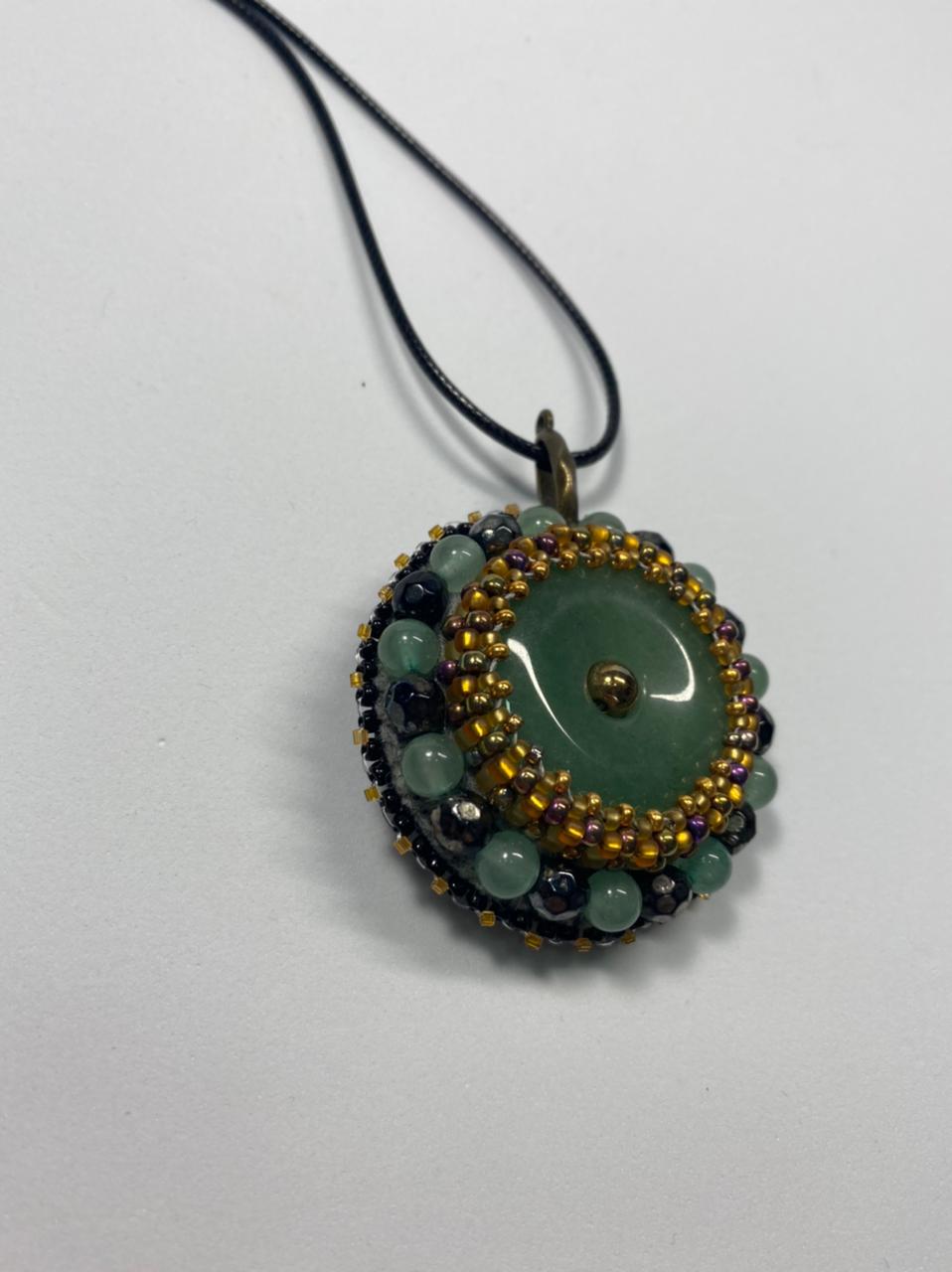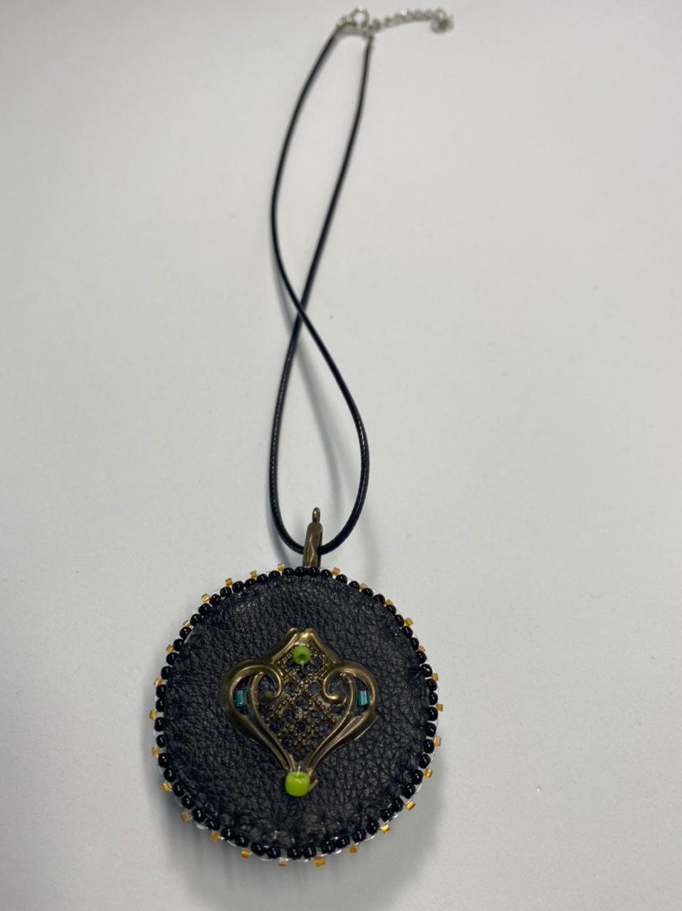 დისკო კულონის მასალა: მწვანე ხალცედონის დისკი (დიამერტი 35მმ), მწვანე ამაზონიტი, ჩეხური მძივი, იაპონური ბისერი, ჰემატიტი, ტყავი, ბრინჟაოსფერი ფილიგრანი და ფურნიტურა.