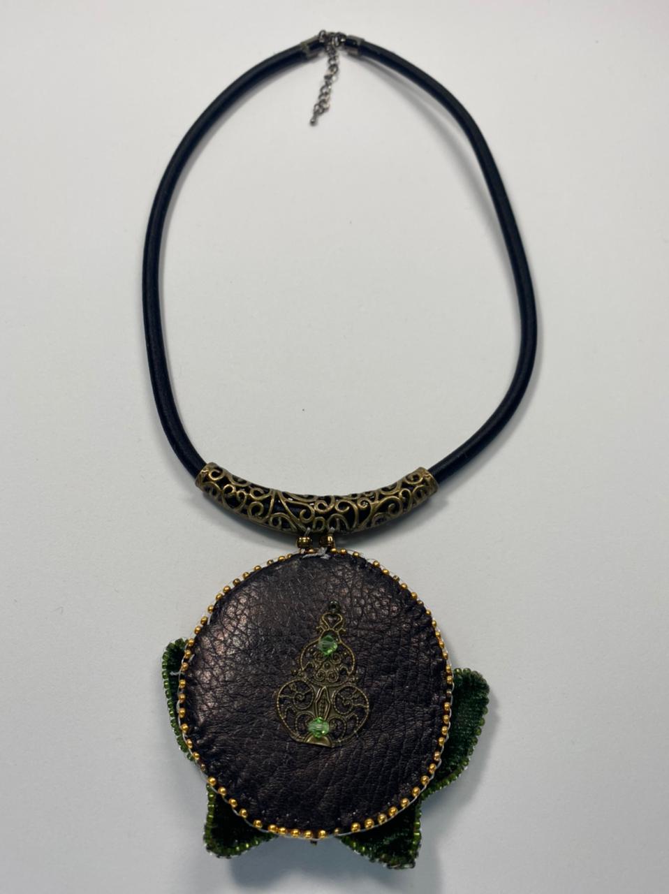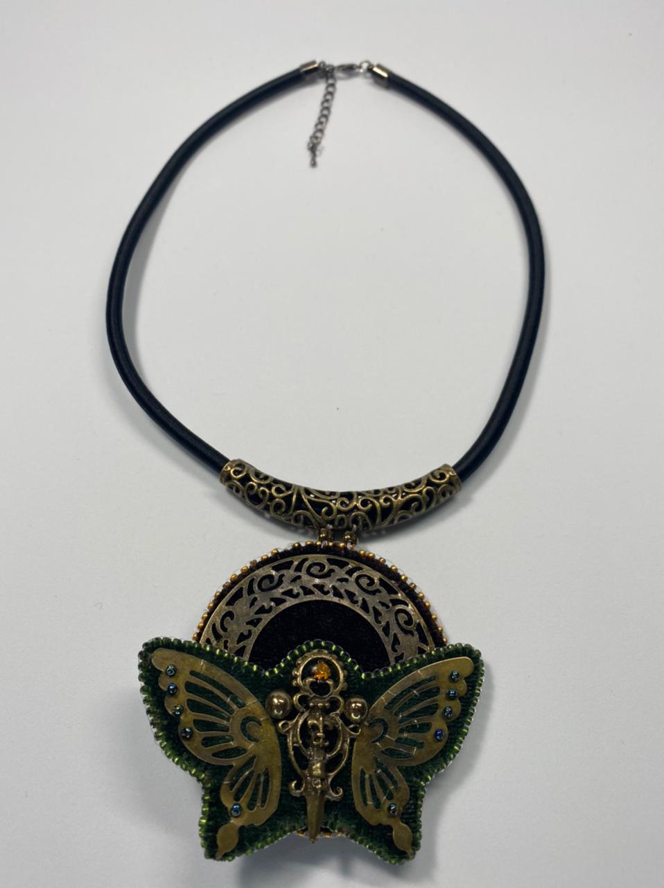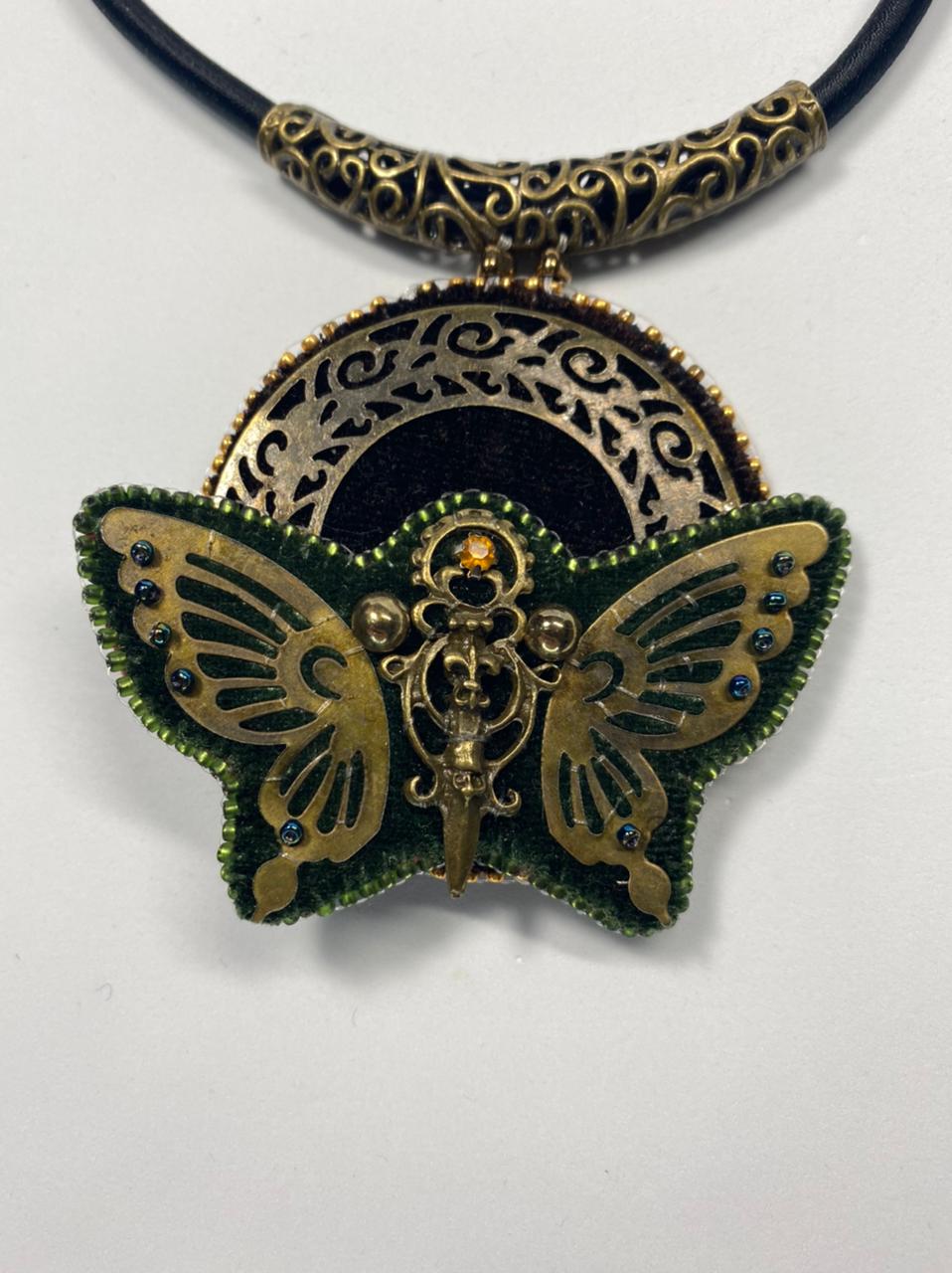 პეპელა კულონის მასალა: ხავერდი, ტყავი, იაპონური ბისერი, ჰემატიტი, ბრინჯაოსფერი ფილიგრანი და ფურნიტურა.